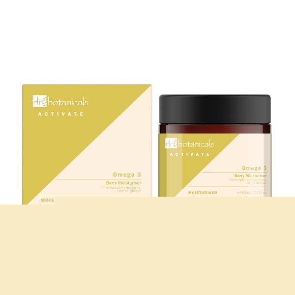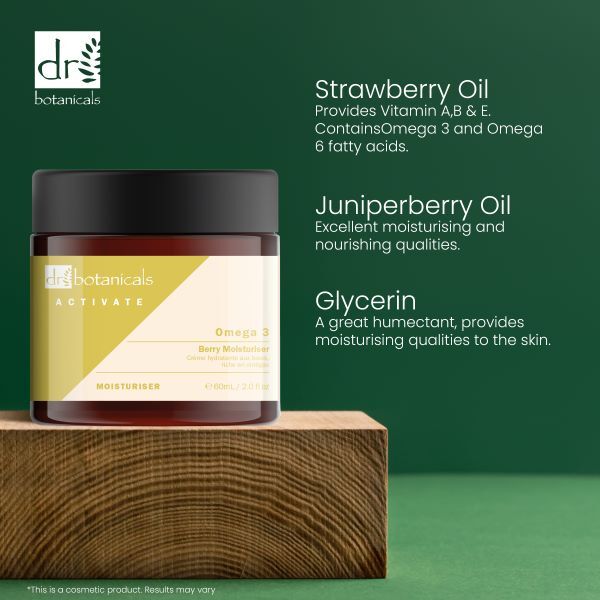 Product Information:Dr Botanicals Omega 3 Berry Moisturizer: clean beauty with organic ingredients like strawberry seed & seabuckthorn oils for healthy, radiant skin,Product Specification:Aqua (Water), Caprylic/Capric Triglyceride, Glycerin, Glyceryl Stearate SE, Cetearyl Alcohol, Stearic Acid, Aroma (Flavor), Benzyl Alcohol, Ammonium Acryloyldimethyltaurate/VP Copolymer, Xanthan Gum, Gluconolactone, Juniperus Communis Fruit Oil, Sodium Benzoate, Fragaria Ananassa (Strawberry) Seed Oil, Hippophae Rhamnoides (Seabuckthorn) Fruit Oil, Dehydroacetic Acid, Calcium Gluconate, CI 17200 (Red 33),Product Uses:Apply Dr Botanicals Activate Omega 3 Berry Moisturizer to clean, dry skin in the morning or evening after cleansing. Its organic and natural ingredients, including strawberry seed oil and seabuckthorn fruit oil, will hydrate and nourish your skin, leaving it healthy and radiant