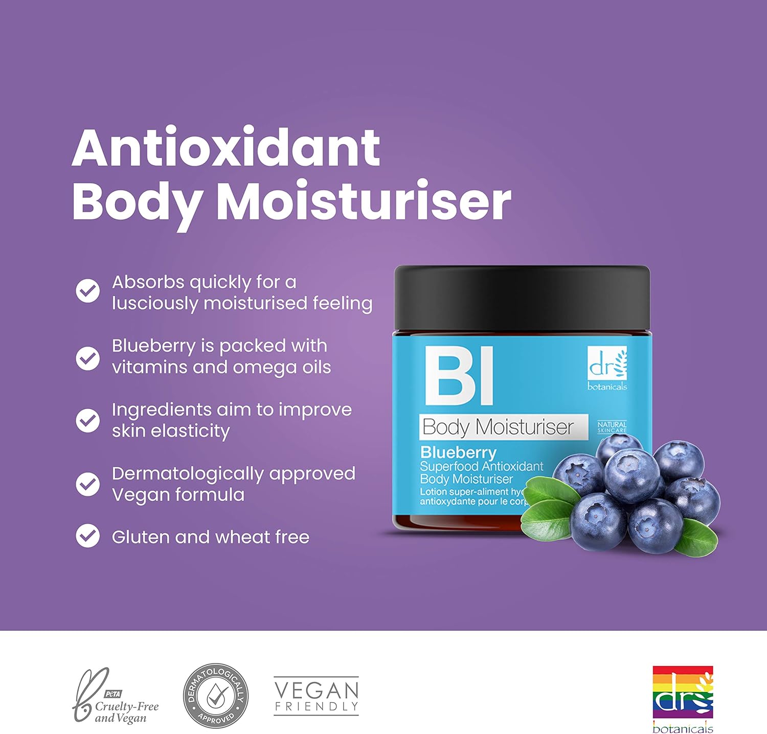 Dr Botanicals Natural Care Blueberry & Juniper berry Superfood Antioxidant intensely moisturizing Body Moisturiser with Vitamin C & E. Vegan & Cruelty Free 60ml