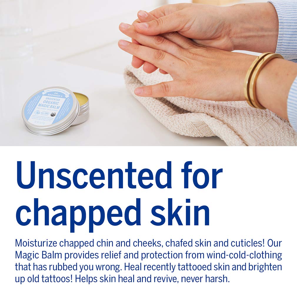 USDA ORGANIC & FAIR TRADE INGREDIENTS: Dr. Bronner's Organic Magic Balms are formulated with organic beeswax to protect against cold, wind & clothes that rub you raw. With organic jojoba, avocado & hemp oil for extra moisture. Soothe your skin!GENTLE ENOUGH FOR DIAPER RASH & RECENTLY TATTOOED SKIN: Our Organic Magic Balm is gentle, yet effective for soothing skin. Helps prevent baby's diaper rash—provides relief for chafed skin. Helps heal recently tattooed skin & brighten up old tattoos!DR. BRONNER’S ORGANIC MAGIC BALM IS VERSATILE: Our balm is a multifunctional product—like most of our products! It can be used to heal dry hands, face, body, cuticles, chins & cheeks. Apply to chafed skin where needed & get reliefOUR MAGIC BALM IS CRUELTY-FREE & NEVER TESTED ON ANIMALS: Dr. Bronner’s products & ingredients are never tested on animals so they qualify for the Leaping Bunny logo. Finally, a balm you can totally get behind!