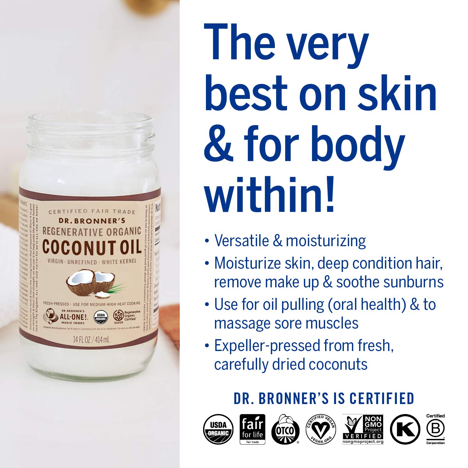 Dr. Bronner'S - Organic Virgin Coconut Oil (White Kernel, 14 Ounce) - Coconut Oil For Cooking, Baking, Hair & Body, Unrefined & Fresh-Pressed, Mild Flavor, Versatile, Fair Trade, Vegan, Non-Gmo