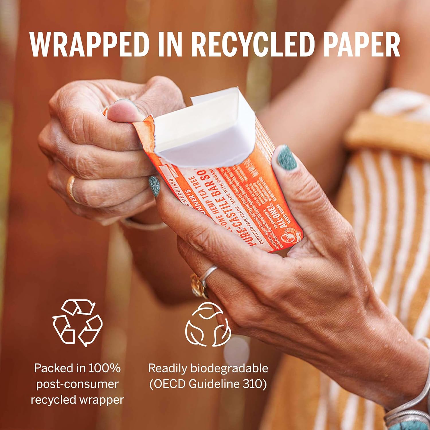 PACKAGED IN POST-CONSUMER RECYCLED WRAPPERS: Dr. Bronner’s bar soaps divert discarded paper waste from landfills by using and increasing demand for recycled materials, reducing landfill buildup. Readily biodegradable (pursuant to OECD Guideline 310