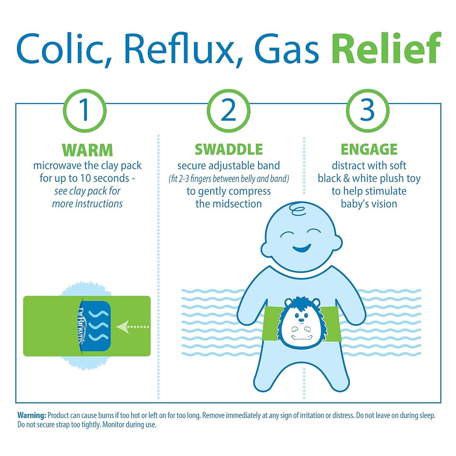 NATURAL GAS RELIEF FOR BABY. Safely soothe baby’s upset belly while providing natural gas and colic relief10COLIC RELIEF. The doctor-designed adjustable heated tummy wrap provides warmth and a gentle compress to help relieve pain associated with colic, reflux and gas10QUICK AND CONVENIENT. The Gripebelt comes with a microwaveable hot pack and is easy to assemble. Simply warm the included natural clay pack in the microwave, secure the adjustable baby belt to gently compress baby’s belly, and engage baby10PROMOTE BRAIN DEVELOPMENT. The baby heating pad uses extra-soft fabric to comfort baby bellies while the soft, snuggly Panda keeps baby engaged10COOLING RELIEF. The clay pack can also be frozen to treat aches and pains