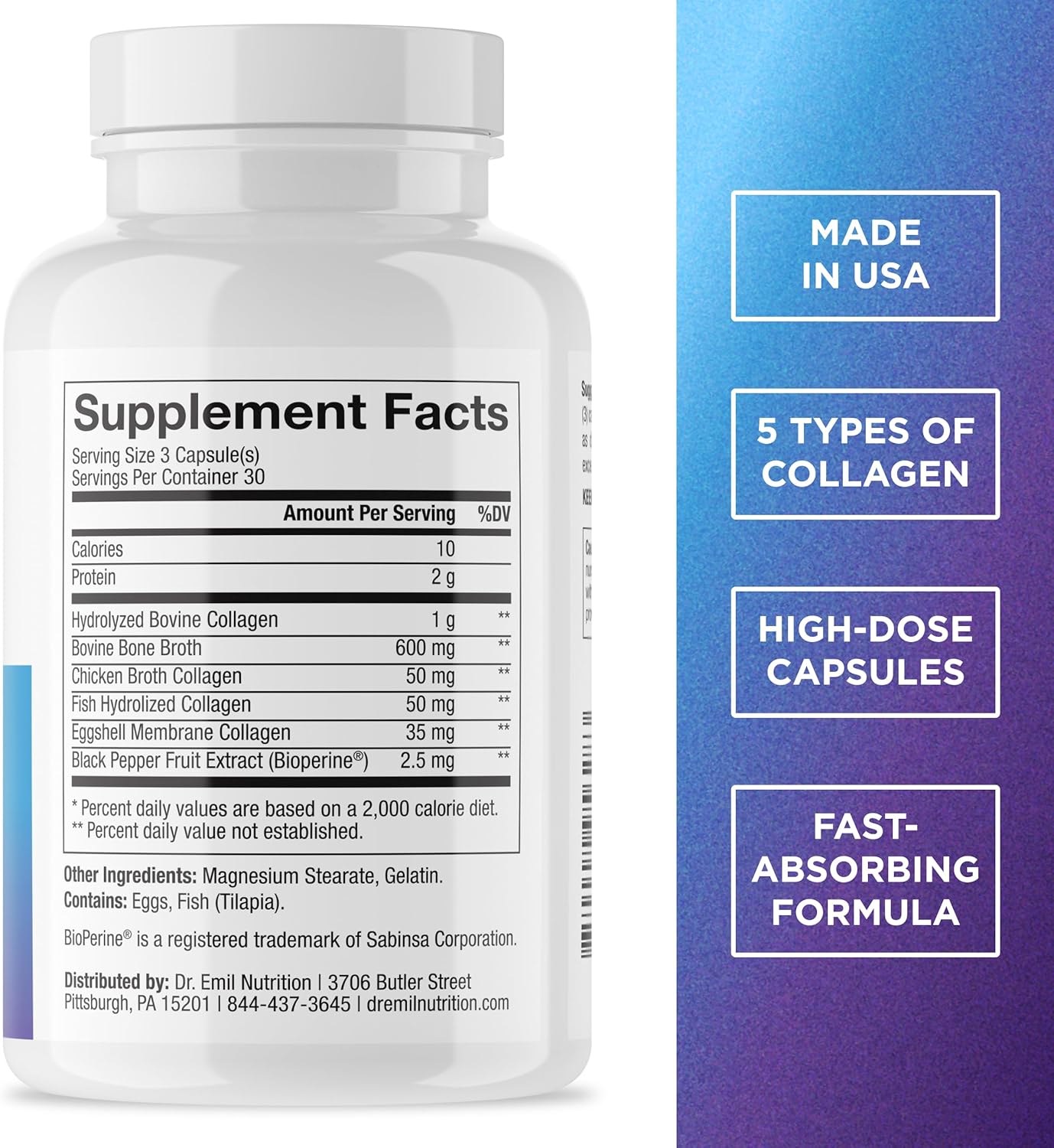 About this item All-in-one Collagen Pills: our bioavailable hydrolyzed collagen peptide pills feature a blend of 100% grass-fed bovine, chicken, eggshell and marine collagen sources, including Types I, II, III, V & X. Dynamic Duo: Biotin and Collagen together are a super-blend for a brighter and more youthful appearance. The pair together contains the amino acids your body needs to produce a protein called keratin that makes our hair and nails thicker & stronger. Supports Hair, Skin, Nails, Joints, & Gut Health: Collagen peptides are known to promote healthy hair, improve skin elasticity, strengthen nails, improve gut health and provide support for strong ligaments and tendons. Provides a Youthful Appearance - Our doctor-derived 5-type super collagen formula is designed to support the anti-aging process by improving skin elasticity, reducing wrinkles and improving skin hydration to support a youthful appearance. Doctor-Derived Quality Formula: Dr. Emil Nutrition Multi Collagen Plus is 100% is made with the highest quality ingredients, manufactured in a cGMP facility and is gluten-free, non-GMO and 100% free of hype, hormones, and empty promises. › See more product details,All-in-one Collagen Pills: our bioavailable hydrolyzed collagen peptide pills feature a blend of 100% grass-fed bovine, chicken, eggshell and marine collagen sources, including Types I, II, III, V & X,Dynamic Duo: Biotin and Collagen together are a super-blend for a brighter and more youthful appearance. The pair together contains the amino acids your body needs to produce a protein called keratin that makes our hair and nails thicker & stronger,Supports Hair, Skin, Nails, Joints, & Gut Health: Collagen peptides are known to promote healthy hair, improve skin elasticity, strengthen nails, improve gut health and provide support for strong ligaments and tendons,Provides a Youthful Appearance - Our doctor-derived 5-type super collagen formula is designed to support the anti-aging process by improving skin elasticity, reducing wrinkles and improving skin hydration to support a youthful appearance,Doctor-Derived Quality Formula: Dr. Emil Nutrition Multi Collagen Plus is 100% is made with the highest quality ingredients, manufactured in a cGMP facility and is gluten-free, non-GMO and 100% free of hype, hormones, and empty promises