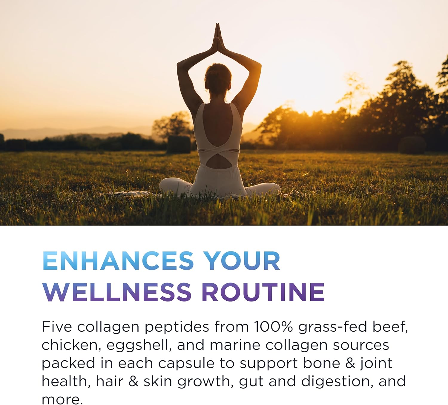 All-in-one Collagen Pills: our bioavailable hydrolyzed collagen peptide pills feature a blend of 100% grass-fed bovine, chicken, eggshell and marine collagen sources, including Types I, II, III, V & X