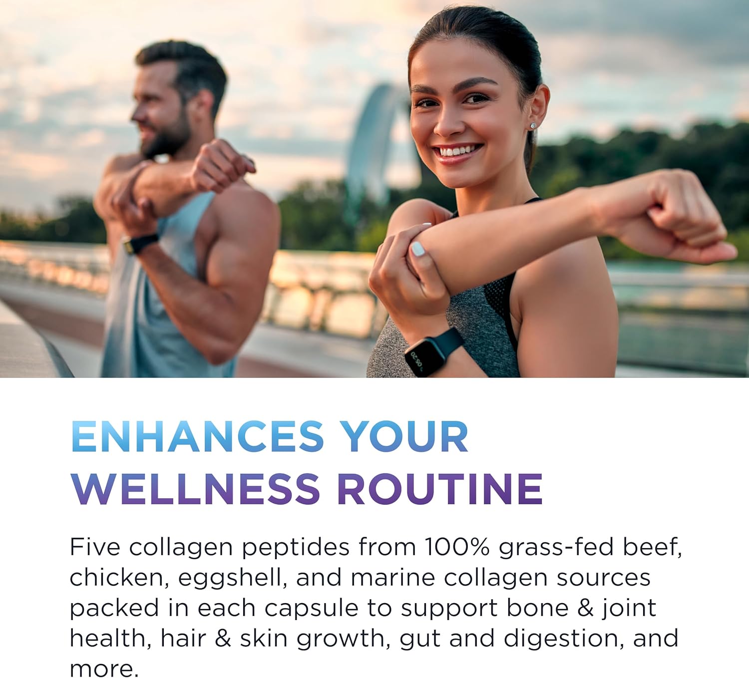 All-in-one Collagen Pills: our bioavailable hydrolyzed collagen peptide pills feature a blend of 100% grass-fed bovine, chicken, eggshell and marine collagen sources, including Types I, II, III, V & X