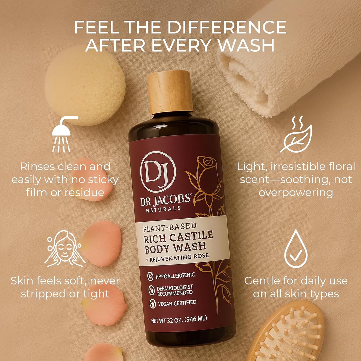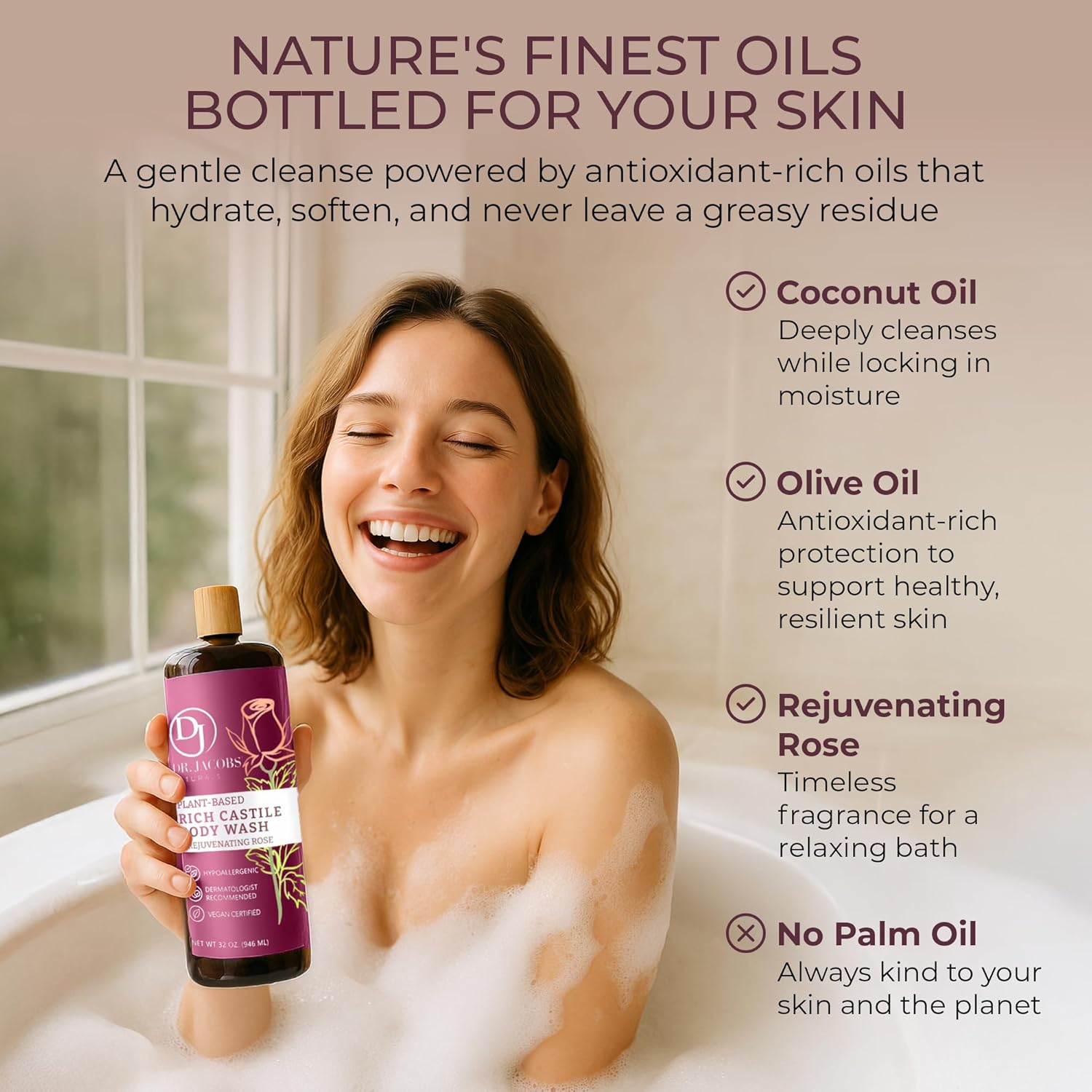 SKIN-SOOTHING LUXURY: Experience DR. JACOBS NATURALS’ Castile body wash, a unique blend with natural plant-based ingredients. It pampers your skin with a lavish, nurturing shower, caring for it with an exclusive formula. It's all about indulgence in every wash