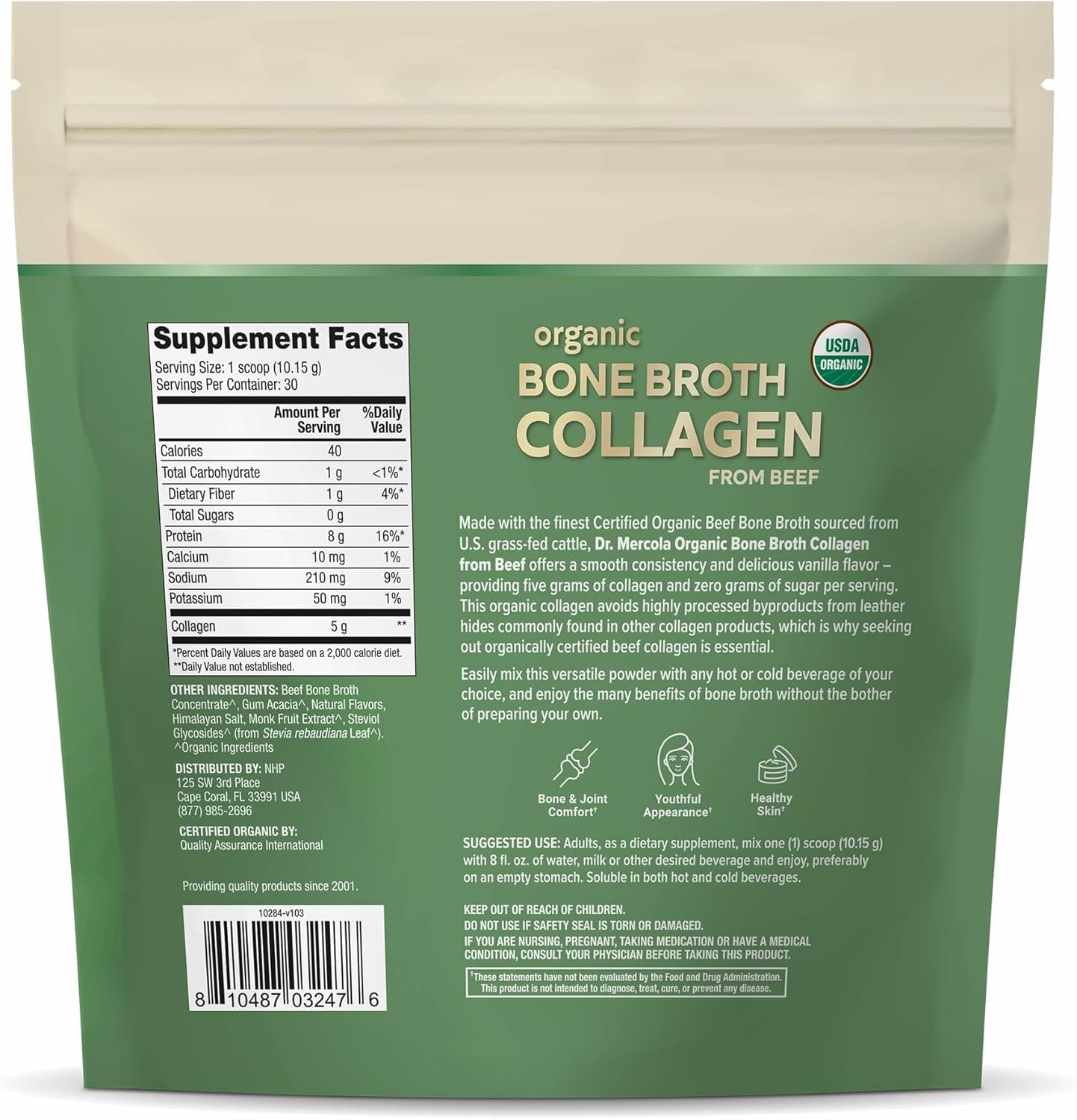 About this item Supports Skin, Hair & Nails Health: Dr. Mercola Organic Bone Broth Collagen Powder provides essential nutrients to help maintain healthy skin, hair, and nails Encourages Joint & Digestive Wellness: This collagen-rich superfood helps support strong bones, muscle recovery, and healthy digestion High-Quality Organic Collagen: Each scoop delivers 5 g of collagen sourced from USDA Organic Beef Bone Broth Concentrate for optimal absorption and effectiveness Delicious & Easy to Use: Enjoy a rich flavor without artificial sweeteners; simply mix into water, coffee, smoothies, or recipes for a nourishing protein boost Empowering You: We give you the resources to take control of your health with regenerative practices and informed consent principles › See more product details,Supports Skin, Hair & Nails Health: Dr. Mercola Organic Bone Broth Collagen Powder provides essential nutrients to help maintain healthy skin, hair, and nails,Encourages Joint & Digestive Wellness: This collagen-rich superfood helps support strong bones, muscle recovery, and healthy digestion,High-Quality Organic Collagen: Each scoop delivers 5 g of collagen sourced from USDA Organic Beef Bone Broth Concentrate for optimal absorption and effectiveness,Delicious & Easy to Use: Enjoy a rich flavor without artificial sweeteners; simply mix into water, coffee, smoothies, or recipes for a nourishing protein boost,Empowering You: We give you the resources to take control of your health with regenerative practices and informed consent principles