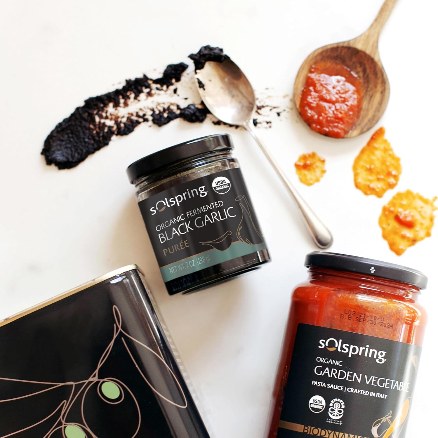 About this item Our Organic Fermented Black Garlic Puree has a distinctive umami flavor with hints of molasses, caramelized onion, seared meat, and balsamic and dates With only two ingredients, garlic bulbs and water, this "black gold" is soft and spreadable, making it a great addition to appetizers, entrees and salads Solspring Fermented Black Garlic Puree is made with premium organic garlic grown and processed in Wisconsin Our unique, eco-friendly fermentation process includes an extensive aging period of at least 120 days, which enhances the sweetness, deepens the flavor, and darkens the color From our farms to your table, Solspring is dedicated to providing great-tasting foods that work with nature and never against it › See more product details,Our Organic Fermented Black Garlic Puree has a distinctive umami flavor with hints of molasses, caramelized onion, seared meat, and balsamic and dates,With only two ingredients, garlic bulbs and water, this "black gold" is soft and spreadable, making it a great addition to appetizers, entrees and salads,Solspring Fermented Black Garlic Puree is made with premium organic garlic grown and processed in Wisconsin,Our unique, eco-friendly fermentation process includes an extensive aging period of at least 120 days, which enhances the sweetness, deepens the flavor, and darkens the color,From our farms to your table, Solspring is dedicated to providing great-tasting foods that work with nature and never against it