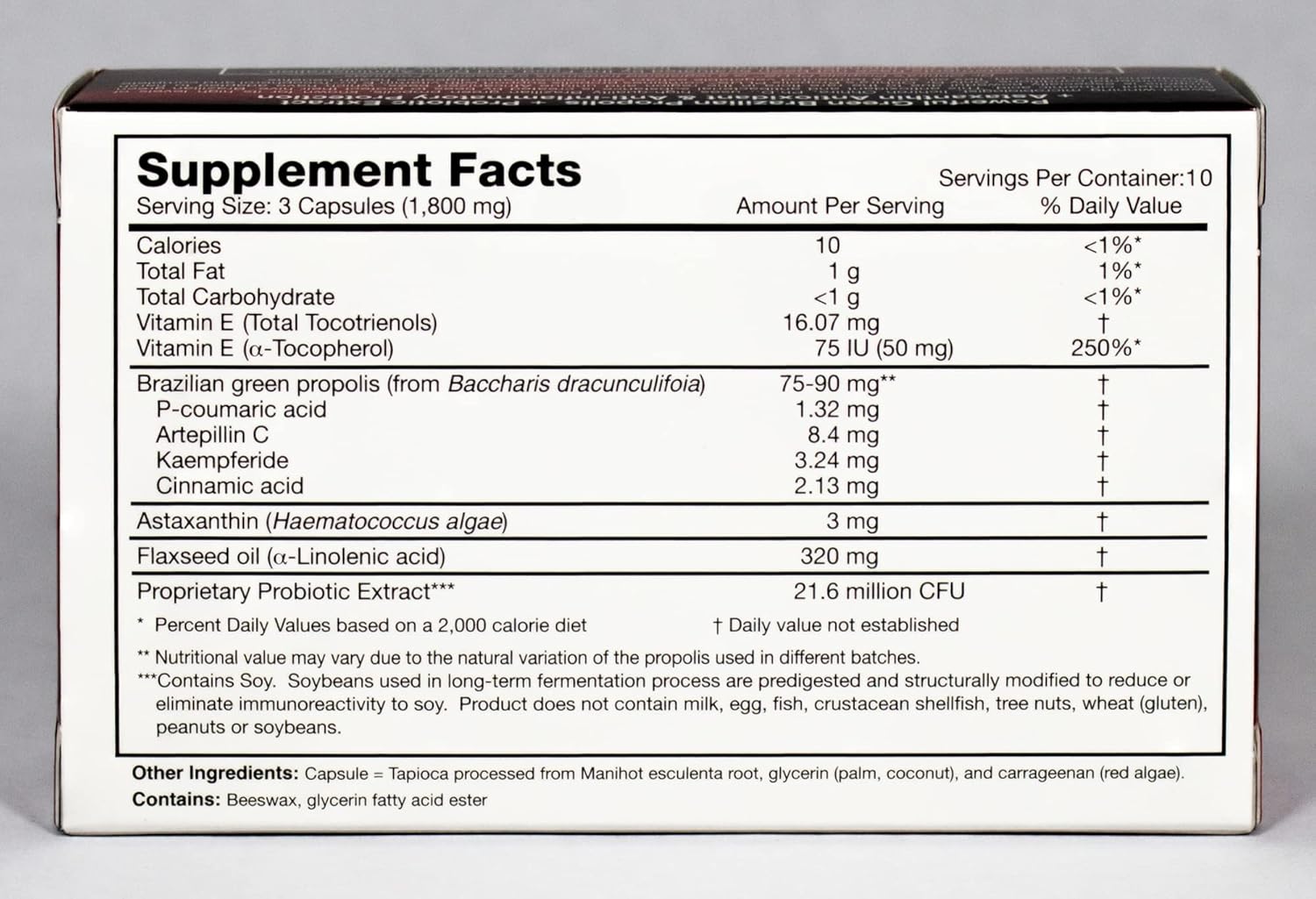 Provides: Brazilian Green Propolis for for immune system support and neuroprotection; Probiotic Support through a powdered form of our fermented vegetable extract for intestinal tract digestive support