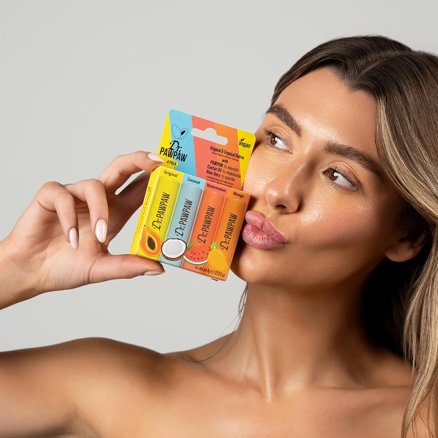 ASSORTMENT OF FLAVORS. This lip set contains Original, Mango, Watermelon, and Coconut lip balms to apply whenever you feel for soft, hydrated lips with a taste. These lip balms give a tropical experience every time