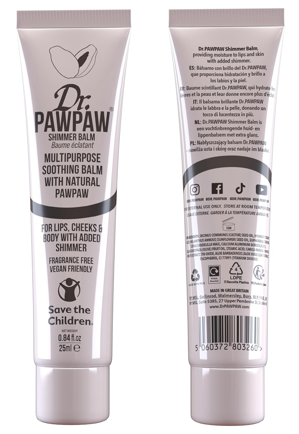 Versatile Glow Enhancer: Elevate your beauty routine with Dr PAWPAW's Shimmer Balm, perfect for adding a pearlescent shimmer to lips, cheekbones, and dƩcolletage