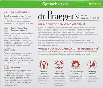 Non-GMO Project Verified, Gluten-Free and Kosher10UNABASHEDLY GREEN - Made with a savory blend of broccolli and potatoes10CONVENIENT AND DELICIOUS - Enjoy a quick, easy-to-prepare meat-free meal the whole family will love10COOK IT YOUR WAY- Pop in your microwave, toss on your stovetop or bake to perfection10SENSIBLY CRAFTED - Stop choosing between nutritious food and indulgence and select wholesome food that makes eating well easy10Dr. Praegerās Sensible Food Inc. was founded in 1992 with the mission to bring delicious frozen food to everyone. Now, two decades later, the next generation is at the helm, inspired by and true to the original mission and values. Weāre still an independent, family-owned and operated business grounded in using simple, whole ingredients to make great-tasting products families love. Weāre continually working to expand our range of products to add new flavors and options that are as delicious to eat as they are easy to serve. Itās easy being green with Dr. Praegerās Sensible Foods. Dr. Praeger's, Spinach Cakes. A tasty mix of spinach, potatoes, and onions, they are perfect at breakfast, lunch or dinner and add veggie flair to any recipe. Our Spinach Cakes are gluten free and Non-GMO verified, plus 2 cakes equals a full serving of veggies!