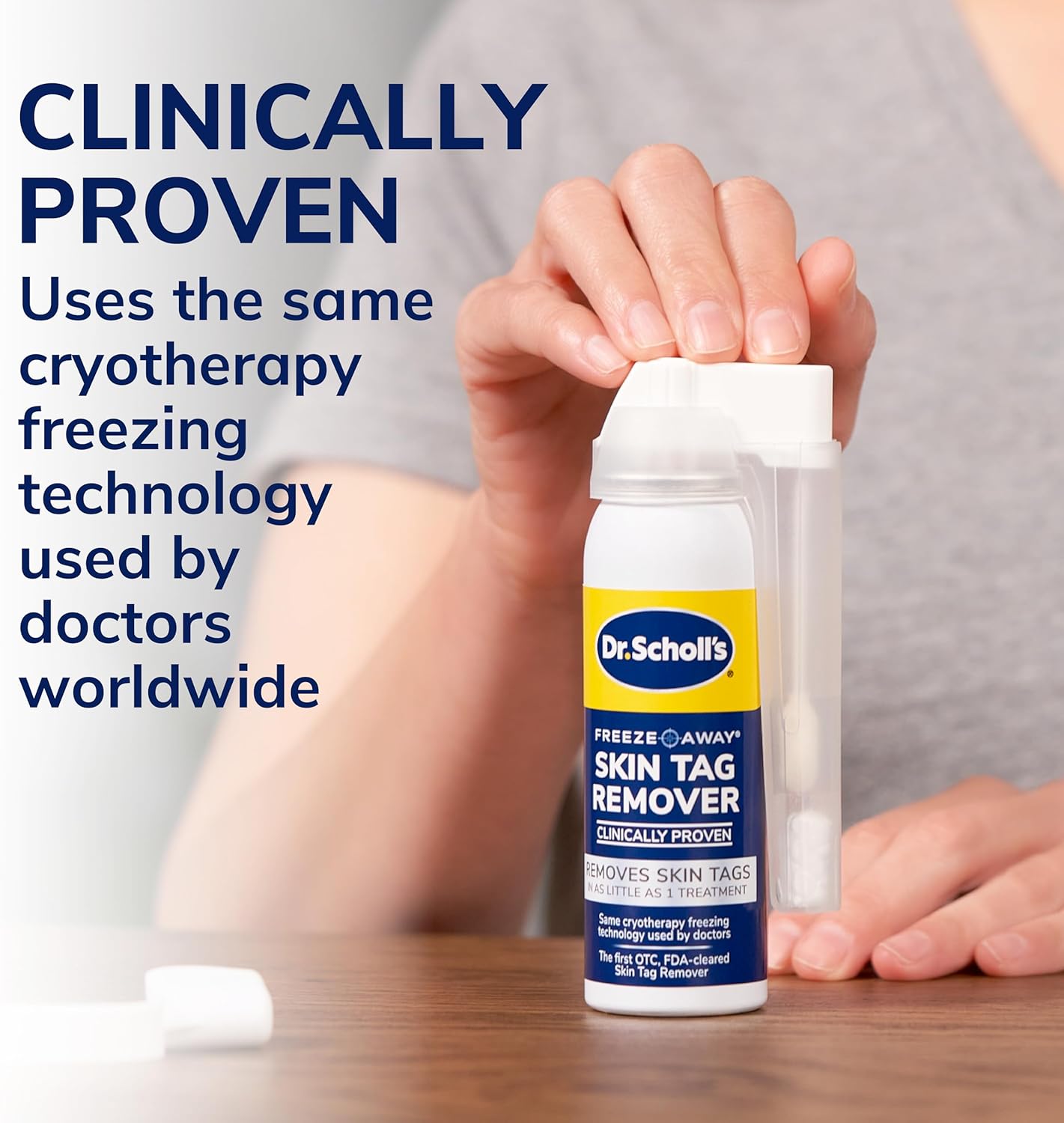 WANT TO GET RID OF YOUR SKIN TAGS: It starts with Dr. Scholl's. Dr. Scholl's Freeze Away Skin Tag Remover is the first FDA-Cleared, over the counter, skin tag removal kit and is clinically proven for safe, effective, skin tag removal in as little as one treatment