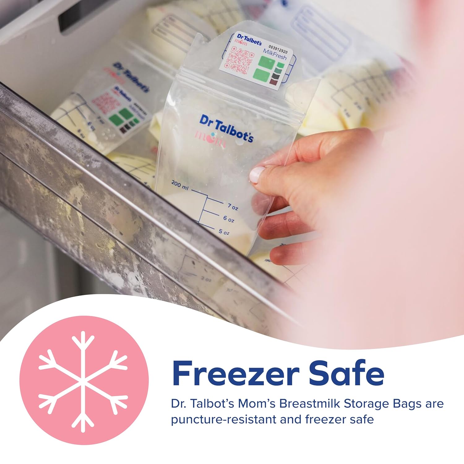 Get the most out of breastfeeding with Dr. Talbot's Mom's Breastmilk Storage Bags. These bags are a newborn essential and are designed to be sturdy and puncture-resistant, ensuring your baby gets the best at every feeding. With 50 bags in every pack, you can organize and optimize breastfeeding and storing extra milk. Whether exclusively nursing, or bottle feeding, let Dr. Talbot's Mom's Breastmilk Storage Bags help give your baby only the best. Dr. Talbot's Mom breastmilk storage freezer bags are a great addition to your baby registry. Pair with Dr. Talbot's Mom breast milk freshness sensors for the perfect baby shower gift,BREASTFEEDING STORAGE BAGS: Dr. Talbot's Mom's Breastmilk Storage Bags are made with mom and baby in mind, ensuring fresh, nutritious milk for every baby feeding,PUNCTURE-RESISTANT AND FREEZER-SAFE: With durability in mind, the bags are puncture-resistant and safe for the freezer, ensuring your milk stays secure and protected during storage,EASY TO USE: The storage bags come pre-sterilized and feature a double seal to keep contaminants out and freshness in,VALUE-PACKED: Each pack of Dr. Talbot's Mom's Breastmilk Storage Bags contains 4 MilkFresh sensors and 50 bags, providing an ample storage supply,NEW MOM AND BABY ESSENTIALS: Explore essential dietary supplements and care items from Dr. Talbot's Mom, featuring innovative formulations across all product ranges,SAFETY FIRST: Expecting mothers can feel safe knowing Dr. Talbot's Mom products are developed, researched, and manufactured to exceed all government safety regulations and standards