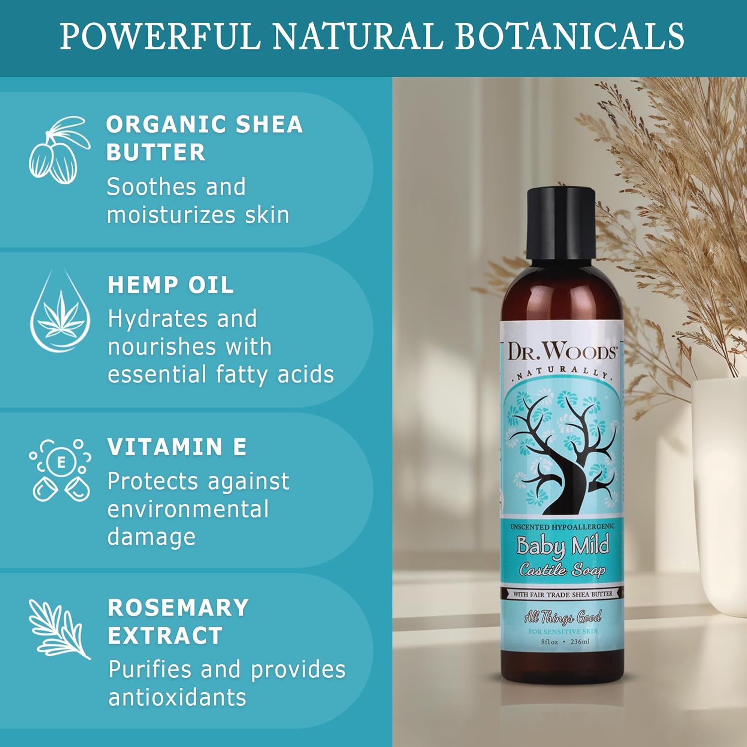 All-purpose, exfoliating and moisturizing cleansing soap which is great for everyday use as a facial cleanser, body wash, shampoo, shaving lather, and acne care, Pamper even the most sensitive skin with Baby Mild Castile Soap; specially formulated to be gentle enough for a baby's precious skin