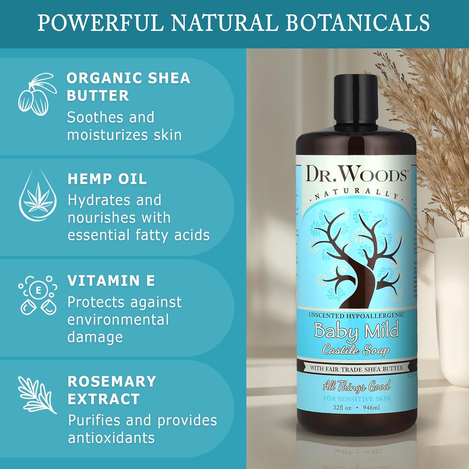 Dr. Woods Baby Mild Unscented Liquid Castile Soap With Organic Shea Butter, 32 Ounce