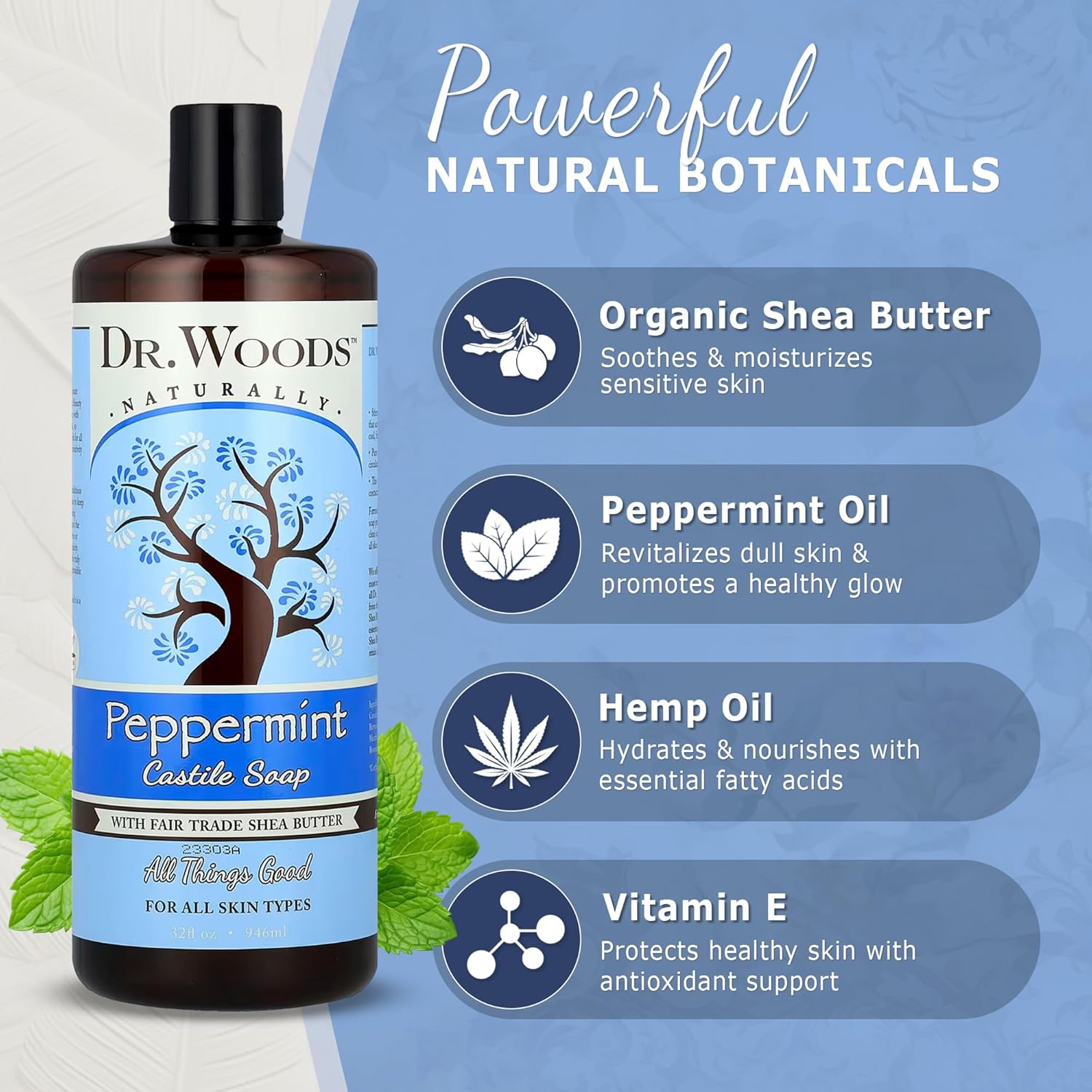 Dr. Woods Peppermint Liquid Castile Soap - Castile Soap With Pure Peppermint Oil, Body Wash For Men And Women, Contains Organic Shea Butter, Natural Cleaner For Face, Hands, And Body - 32 Fl Oz