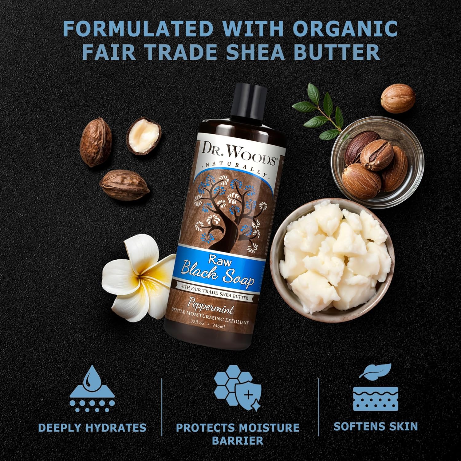 Dr. Woods Raw African Liquid Peppermint Black Soap - Body Wash For Men And Women, Contains Peppermint Oil And Organic Shea Butter, Gentle Exfoliant, Natural Cleanser For Face, Hands, Body - 32 Fl Oz
