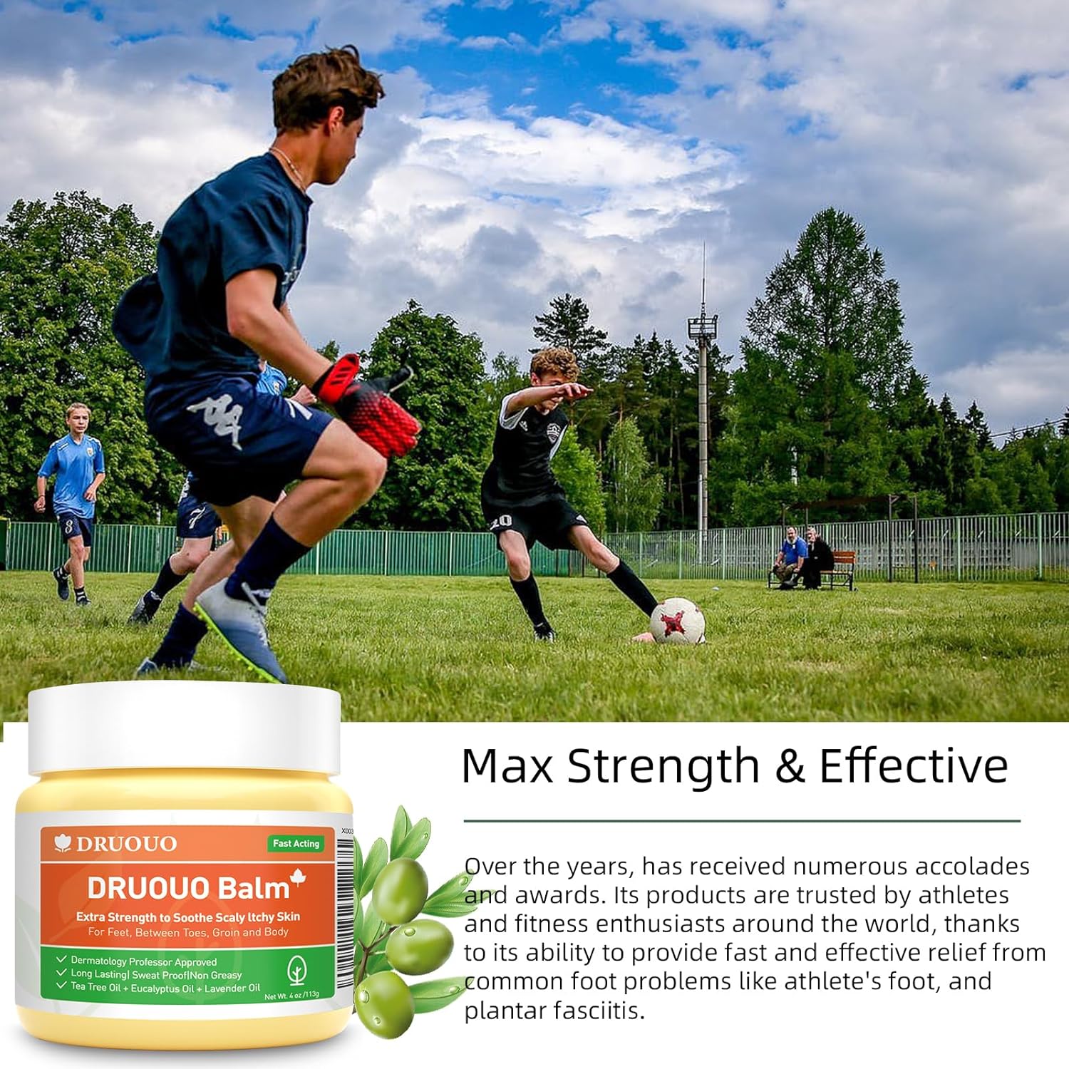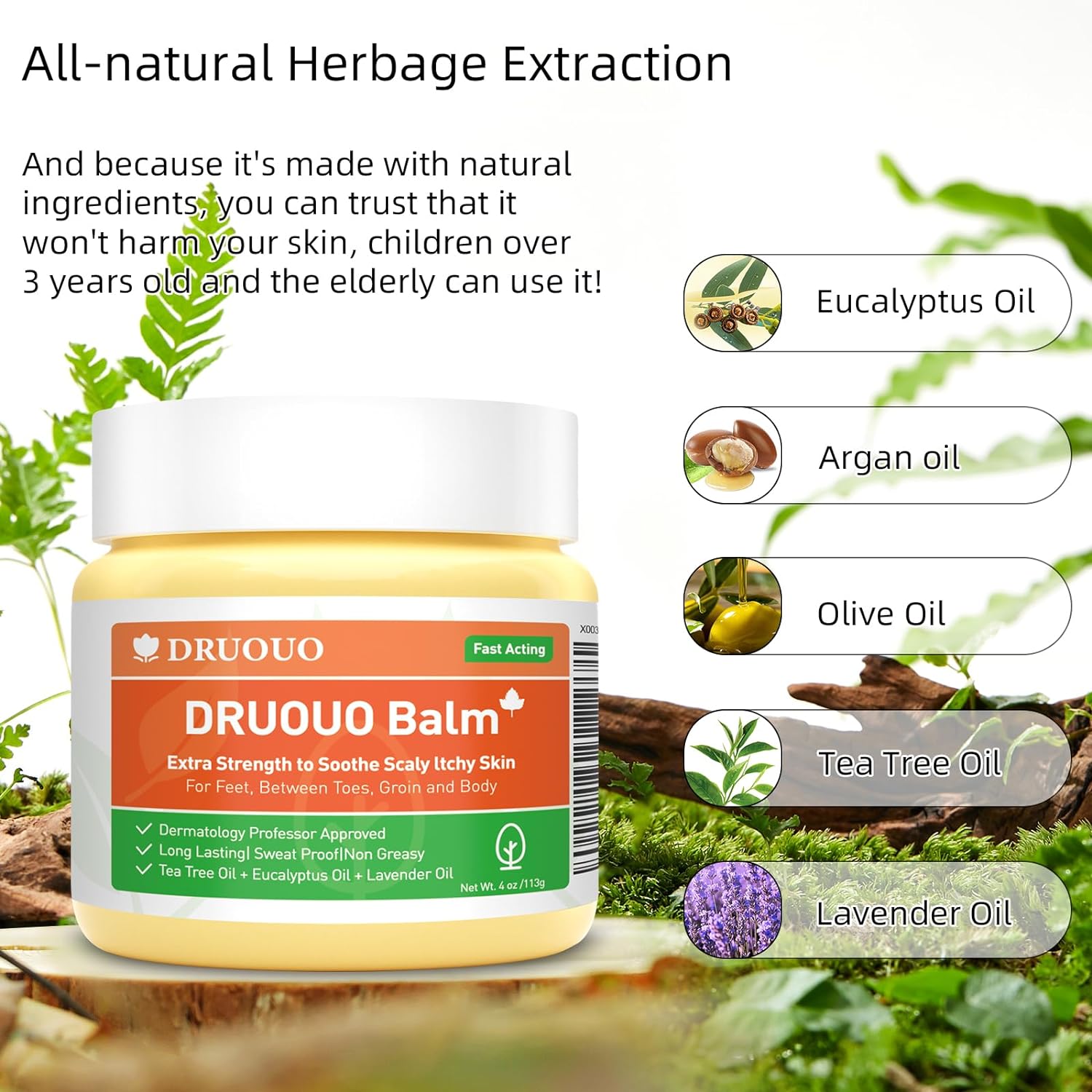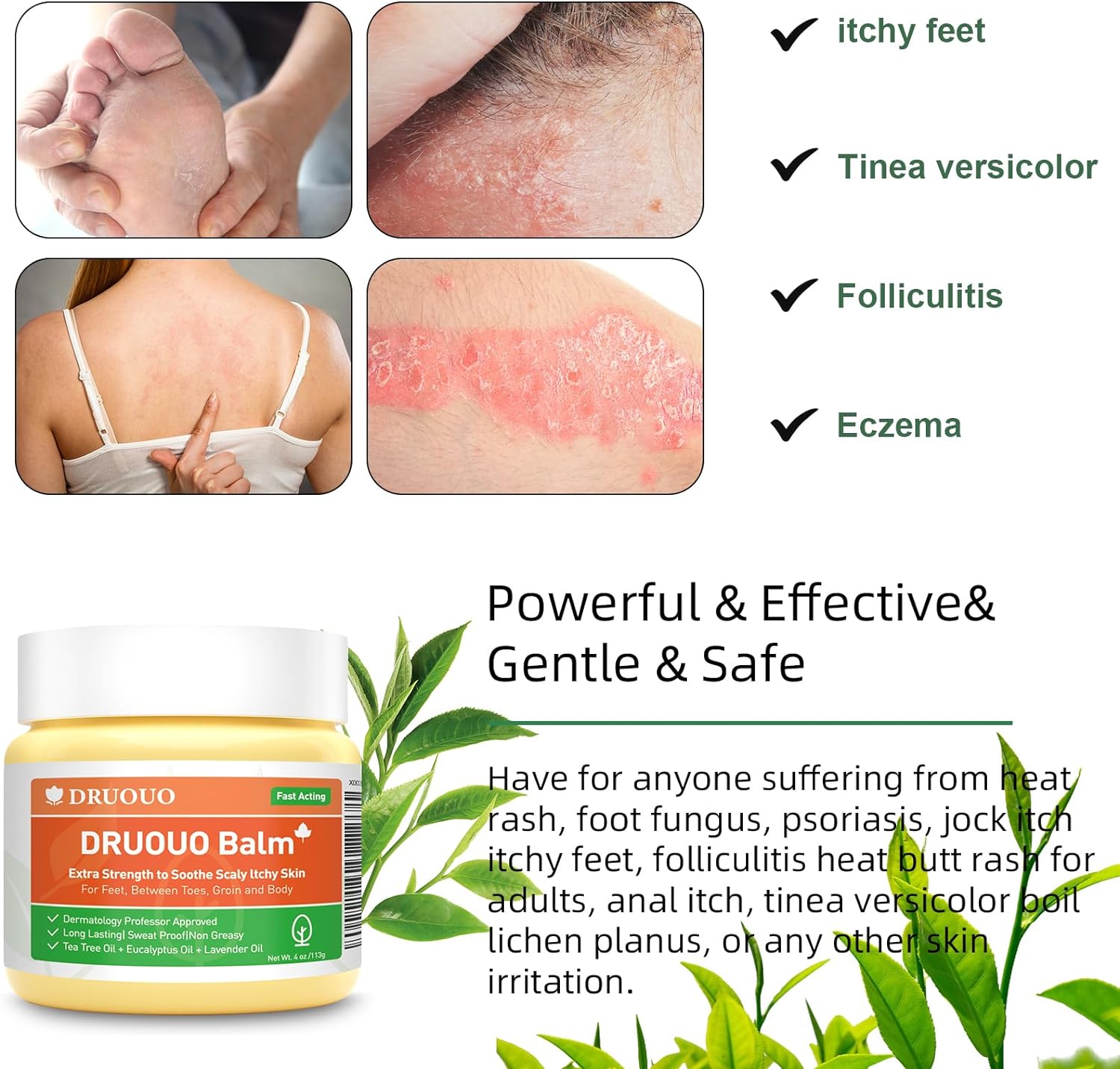 Our Eczema Cream is a best-selling product worldwide and has earned a worldwide reputation for its superior quality and effectiveness in quickly addressing challenging skin concerns. Our ointment is an American heritage that has provided reliable and effective relief for over a century. This time-honoured product has been recommended by a distinguished skin professor emphasizing its effectiveness and reliability in treating skin disorders. We draw on our century-long skincare expertise10Our skin ointment features a powerful blend of botanical ingredients that have been refined and perfected for over a century. Comprising potent doses of Tea Tree and Eucalyptus essential oils, our formula effectively soothes itchy and eczema-prone skin, while nourishing oils relieve dryness and discomfort. Our ointment quickly penetrates the skin barrier and is quickly absorbed, ensuring fast and effective results for maximum comfort10Non-greasy, lightweight formula that delivers unparalleled sweatproof protection, creating a natural barrier that lasts all day long, Can be applied to various areas of the body, including feet, between toes, groin, and sensitive, intimate regions, providing continual relief that's neither heavy nor pore-clogging. DRUOUO keeps skin looking and smelling clean, making it a great daily solution for preventing unpleasant foot odours or skin eczema, and psoriasis and maintaining optimal hygiene10Our ointment is a versatile solution suitable for use by people of all ages, including children and adults. It is both safe and effective, making it ideal for treating skin conditions on any part of the body. This makes it an excellent option for households with multiple individuals experiencing ringworm symptoms. The fast-acting tea tree oil balm has received the "brilliant skin" seal for its exceptional effectiveness and safety profile10The quick-acting formula can quickly alleviate common ringworm symptoms such as itching and burning. the efficient formula can quickly alleviate the discomfort of tinea, ensuring that you bid farewell to the frustration and inconvenience caused by repeated outbreaks. We believe that our itching and tinea cream can control recurrence, and prevent future skin problems from erupting, and you can return our products within 90 days, no questions asked1010