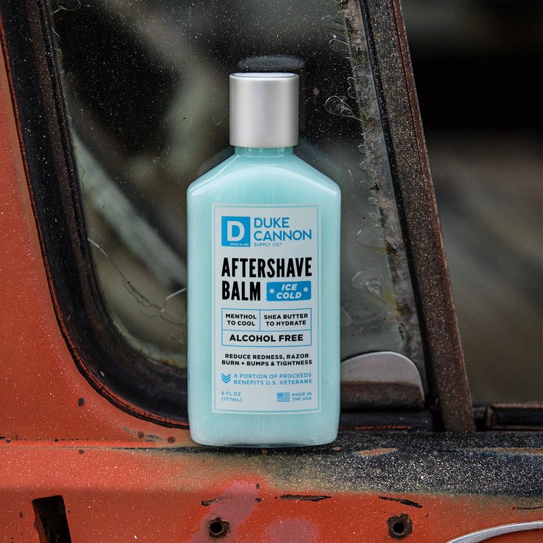About this item MENS AFTER SHAVE COOLING BALM - ICE COLD. Helps to reduce redness, razor burn and tightness. Alcohol-free shave balm brings instant cooling relief to your face. Helps to reduce redness, razor burn and tightness. SUPERIOR INGREDIENTS - A mixture of aloe, shea butter, baobab oil, and allantoin provide hydration while minimizing irritation from razor burn. Not included in our product are harmful ingredients such as alcohol, parabens, and sulfates. UNIQUE COOLING EFFECT - Premium formulation of menthol, tea tree, and Tamanu oil helps to repair and close pores almost instantaneously. This aftershave reduces redness, razor burn, and bumps that are typically the result of shaving. ABOUT US - Duke Cannon honors hard work, chivalry, and patriotism, celebrating builders, creators and those who serve. Committed to high-quality grooming made in the USA, we reflect values of community and respect for hardworking men. See more product details,MENS AFTER SHAVE COOLING BALM - ICE COLD. Helps to reduce redness, razor burn and tightness. Alcohol-free shave balm brings instant cooling relief to your face. Helps to reduce redness, razor burn and tightness,SUPERIOR INGREDIENTS - A mixture of aloe, shea butter, baobab oil, and allantoin provide hydration while minimizing irritation from razor burn. Not included in our product are harmful ingredients such as alcohol, parabens, and sulfates,UNIQUE COOLING EFFECT - Premium formulation of menthol, tea tree, and Tamanu oil helps to repair and close pores almost instantaneously. This aftershave reduces redness, razor burn, and bumps that are typically the result of shaving,ABOUT US - Duke Cannon honors hard work, chivalry, and patriotism, celebrating builders, creators and those who serve. Committed to high-quality grooming made in the USA, we reflect values of community and respect for hardworking men