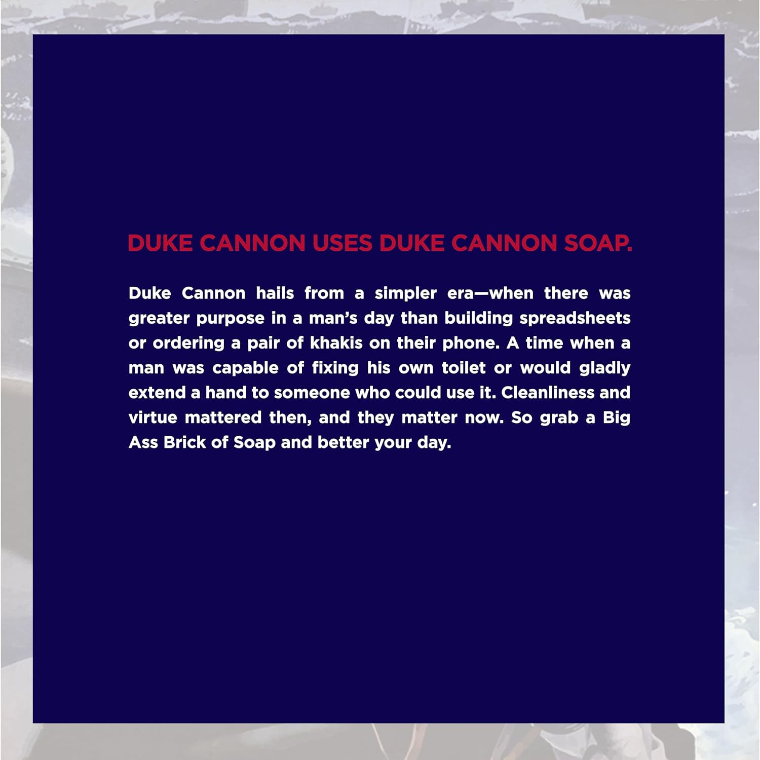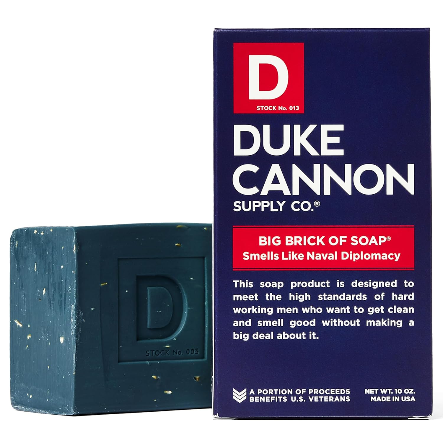 About this item Duke Cannon Naval Diplomacy, Big Brick of Soap for Men, 10 ounce Blue Soap Bar has refreshing Ocean Scent with a package sporting the official colors of the U.S. Navy. At 10 ounces our men's bar soap is 3x bigger than feminine soaps. Triple milled for superior quality Designed to meet the high standards of hard working men who want to get clean and smell good without using feminine shower gels Made in the USA | A Portion of Proceeds Benefits U.S. Veterans | Cruelty-Free. Our products are never tested on animals, just bad interns See more product details,Duke Cannon Naval Diplomacy, Big Brick of Soap for Men, 10 ounce,Blue Soap Bar has refreshing Ocean Scent with a package sporting the official colors of the U.S. Navy,At 10 ounces our men's bar soap is 3x bigger than feminine soaps. Triple milled for superior quality,Designed to meet the high standards of hard working men who want to get clean and smell good without using feminine shower gels,Made in the USA | A Portion of Proceeds Benefits U.S. Veterans | Cruelty-Free. Our products are never tested on animals, just bad interns