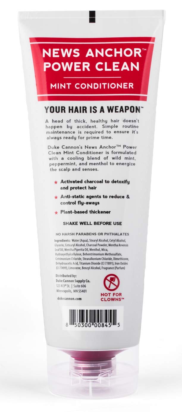 ABOUT THE PRODUCT: 1 > Duke Cannon News Anchor Power Clean Mint Conditioner, 8 Fluid Ounce 2 > For News Anchor Thick Hair: For the man whose hair commands the respect of others, there is no substitute. Your hair is a weapon 3 > Men's Conditioner formulated with a cooling blend of wild mint, peppermint, and menthol to energize the scalp and sensesDUKE CANNON NEWS ANCHOR POWER CLEAN MINT CONDITIONER, 8 FL. OZ.: Ahead of thick, healthy hair doesn't happen by accident. Simple, routine maintenance is required to ensure it's always ready for prime time. Duke Cannon's Power Clean Mint Conditioner is formulated with a cooling blend of wild mint, peppermint, and menthol to energize the scalp and senses. Formulated with Premium Ingredients: Activated charcoal to detoxify and protect hair daily. Anti-static agents to reduce and control fly-aways. Plant-based thickener. No harsh Phthalates. Paraben-Free. || INGREDIENTS: WATER (AQUA), STEARYL ALCOHOL, CETYL ALCOHOL, GLYCERIN, CETARYL ALCOHOL, CHARCOAL POWDER, MENTHA ARVENSIS LEAF OIL, MENTHA PIPERITA OIL, MENTHOL, MICA, HYDROXYETHYLCELLULOSE, BEHENTRIMONIUM METHOSULFATE, CETRIMONIUM CHLORIDE, STEARALKONIUM CHLORIDE, DIMETHICONE, DEHYDROACETIC ACID, TITANIUM DIOXIDE (CI 77891), IRON OXIDES (CI 77499), LIMONENE, BENZYL ALCOHOL, FRAGRANCE (PARFUM)
