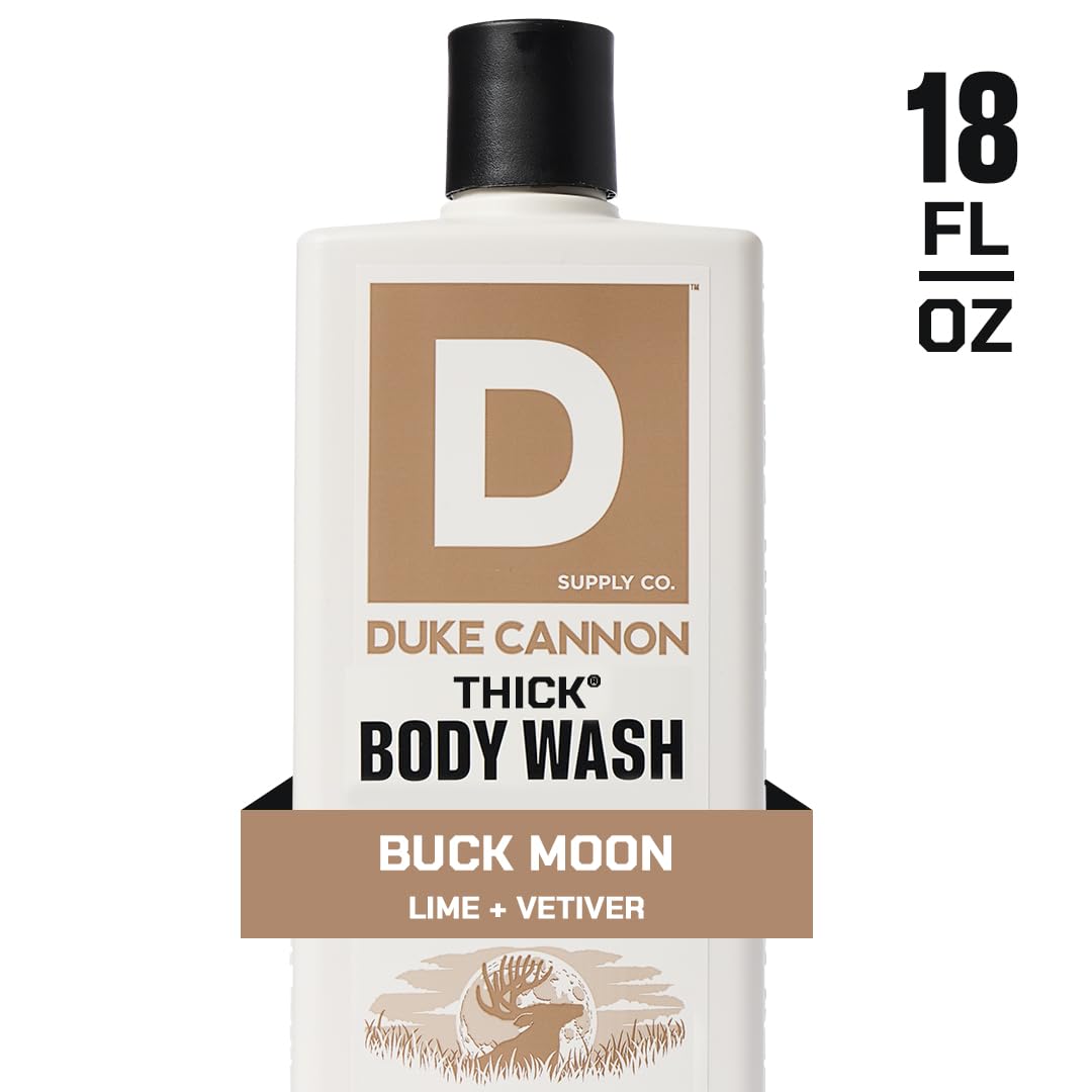 About this item Duke Cannon Buck Moon Body Wash - Premium men’s shower soap that cleanses, hydrates, and lasts. Designed for a fresh, clean feel with high-quality ingredients. Perfect for daily use, gifting, or upgrading your shower routine. Rich Buck Moon Scent – Duke Cannon’s Buck Moon scent blends earthy spices and rich woods, evoking the calm beauty of nature under a full moon. Notes of amber, moss, and cedarwood create a bold, rugged aroma inspired by the wilderness. Duke Cannon Body Wash – Thick, high-viscosity formula designed for men. Cleanses dirt, sweat, and odor while moisturizing skin with a bold, long-lasting scent. Perfect for daily use, athletes, and active lifestyles—tough on grime, gentle on skin. How to Use Duke Cannon Body Wash – Apply a small amount to a loofah or washcloth, lather, and scrub to remove dirt, sweat, and odor. Cleans deeply while moisturizing skin with a bold, long-lasting scent. Perfect for daily use and hard-working men. About Duke Cannon - Duke Cannon honors hard work, chivalry, and patriotism, celebrating builders, creators and those who serve. Committed to high-quality grooming made in the USA, we reflect values of community and respect for hardworking men. See more product details,Duke Cannon Buck Moon Body Wash - Premium men’s shower soap that cleanses, hydrates, and lasts. Designed for a fresh, clean feel with high-quality ingredients. Perfect for daily use, gifting, or upgrading your shower routine,Rich Buck Moon Scent – Duke Cannon’s Buck Moon scent blends earthy spices and rich woods, evoking the calm beauty of nature under a full moon. Notes of amber, moss, and cedarwood create a bold, rugged aroma inspired by the wilderness,Duke Cannon Body Wash – Thick, high-viscosity formula designed for men. Cleanses dirt, sweat, and odor while moisturizing skin with a bold, long-lasting scent. Perfect for daily use, athletes, and active lifestyles—tough on grime, gentle on skin,How to Use Duke Cannon Body Wash – Apply a small amount to a loofah or washcloth, lather, and scrub to remove dirt, sweat, and odor. Cleans deeply while moisturizing skin with a bold, long-lasting scent. Perfect for daily use and hard-working men,About Duke Cannon - Duke Cannon honors hard work, chivalry, and patriotism, celebrating builders, creators and those who serve. Committed to high-quality grooming made in the USA, we reflect values of community and respect for hardworking men