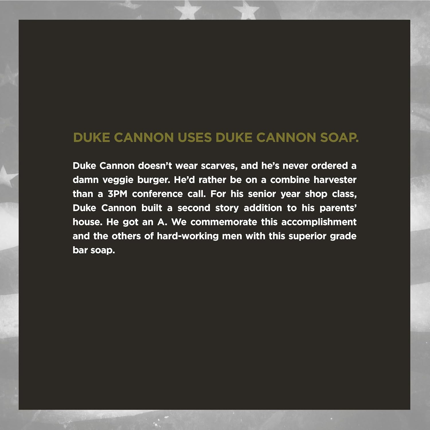 About this item Superior Quality, Triple-Milled β Duke Cannon Big Ass Brick of Soap is triple-milled for a dense, long-lasting lather that delivers an ultra-clean feel without breaking down quickly. Massive 10 oz. Bar β At 10 oz., this soap is 3x the size of regular bar soaps, designed to last longer and withstand the toughest daily use. Crafted in the USA β Proudly made in the USA, each bar embodies American craftsmanship and premium quality standards. Masculine Scents for Hardworking Men β Available in a variety of bold, masculine scents, each bar is designed to keep you smelling fresh and clean all day long, no matter how tough the job. Supports U.S. Veterans β A portion of the proceeds from every purchase supports U.S. veterans' causes, so you can feel good about using a product that gives back. See more product details,Superior Quality, Triple-Milled β Duke Cannon Big Ass Brick of Soap is triple-milled for a dense, long-lasting lather that delivers an ultra-clean feel without breaking down quickly,Massive 10 oz. Bar β At 10 oz., this soap is 3x the size of regular bar soaps, designed to last longer and withstand the toughest daily use,Crafted in the USA β Proudly made in the USA, each bar embodies American craftsmanship and premium quality standards,Masculine Scents for Hardworking Men β Available in a variety of bold, masculine scents, each bar is designed to keep you smelling fresh and clean all day long, no matter how tough the job,Supports U.S. Veterans β A portion of the proceeds from every purchase supports U.S. veterans' causes, so you can feel good about using a product that gives back