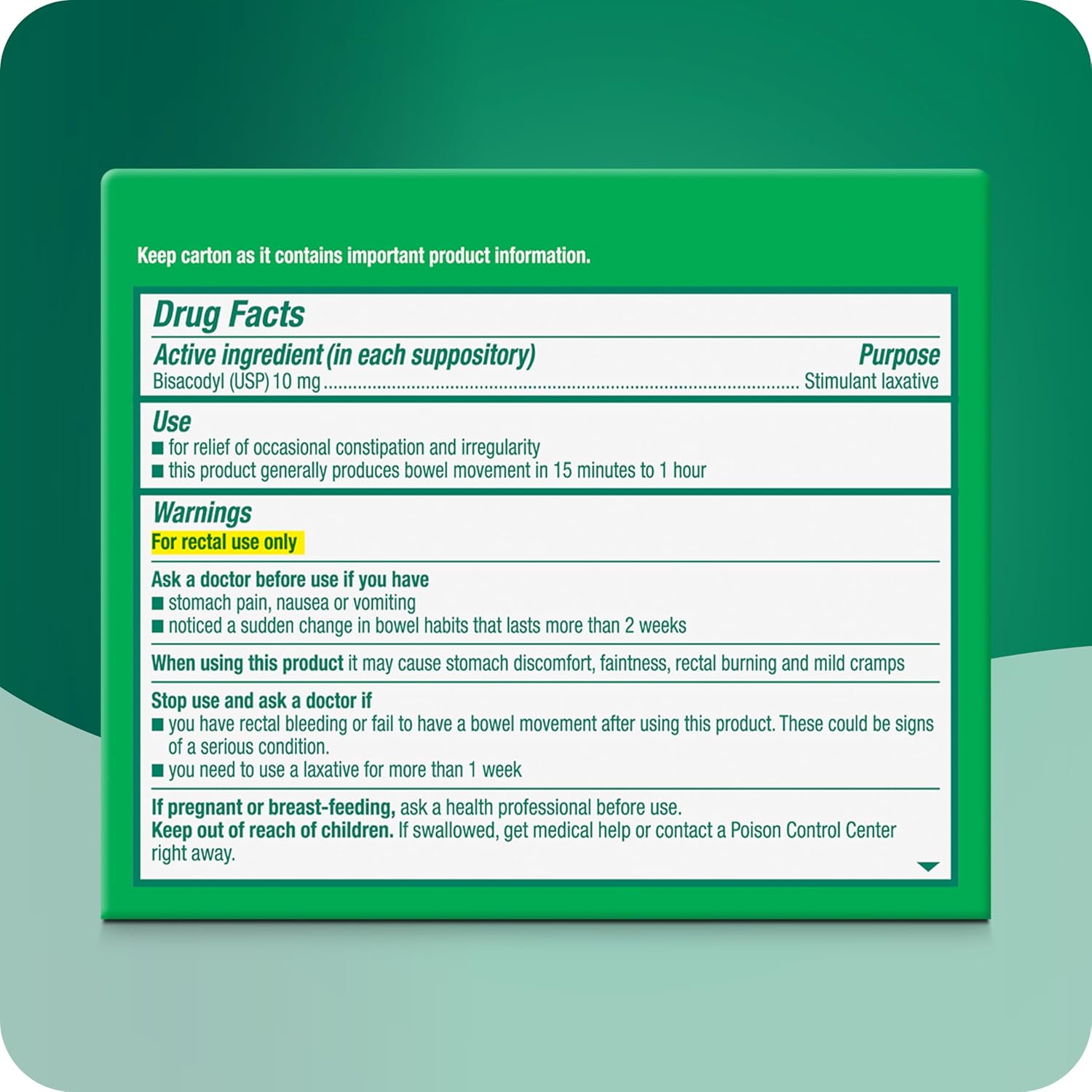 About this item Includes: One (1) 28-count box of Dulcolax medicated stimulant laxative suppositories Works fast: Dulcolax suppositories provide fast relief from constipation in as little as 15 to 60 minutes Targets the source: Suppositories deliver the active ingredient directly into the rectum for localized relief where it's needed Effective active ingredient: Dulcolax medicated laxative suppositories are made with 10 mg bisacodyl, which stimulates your gut muscles to move things out On-the-go relief: Pack these compact laxative suppositories in your travel essentials to help you get back to being regular when stress and overindulgence slow you down Doctor recommended: Dulcolax is the No. 1 doctor-recommended brand among OTC stimulant laxative brands Comfort-shaped: These laxative suppositories are made to comfortably insert and retain to give you the relief you need See more product details,Includes: One (1) 28-count box of Dulcolax medicated stimulant laxative suppositories,Works fast: Dulcolax suppositories provide fast relief from constipation in as little as 15 to 60 minutes,Targets the source: Suppositories deliver the active ingredient directly into the rectum for localized relief where it's needed,Effective active ingredient: Dulcolax medicated laxative suppositories are made with 10 mg bisacodyl, which stimulates your gut muscles to move things out,On-the-go relief: Pack these compact laxative suppositories in your travel essentials to help you get back to being regular when stress and overindulgence slow you down,Doctor recommended: Dulcolax is the No. 1 doctor-recommended brand among OTC stimulant laxative brands,Comfort-shaped: These laxative suppositories are made to comfortably insert and retain to give you the relief you need