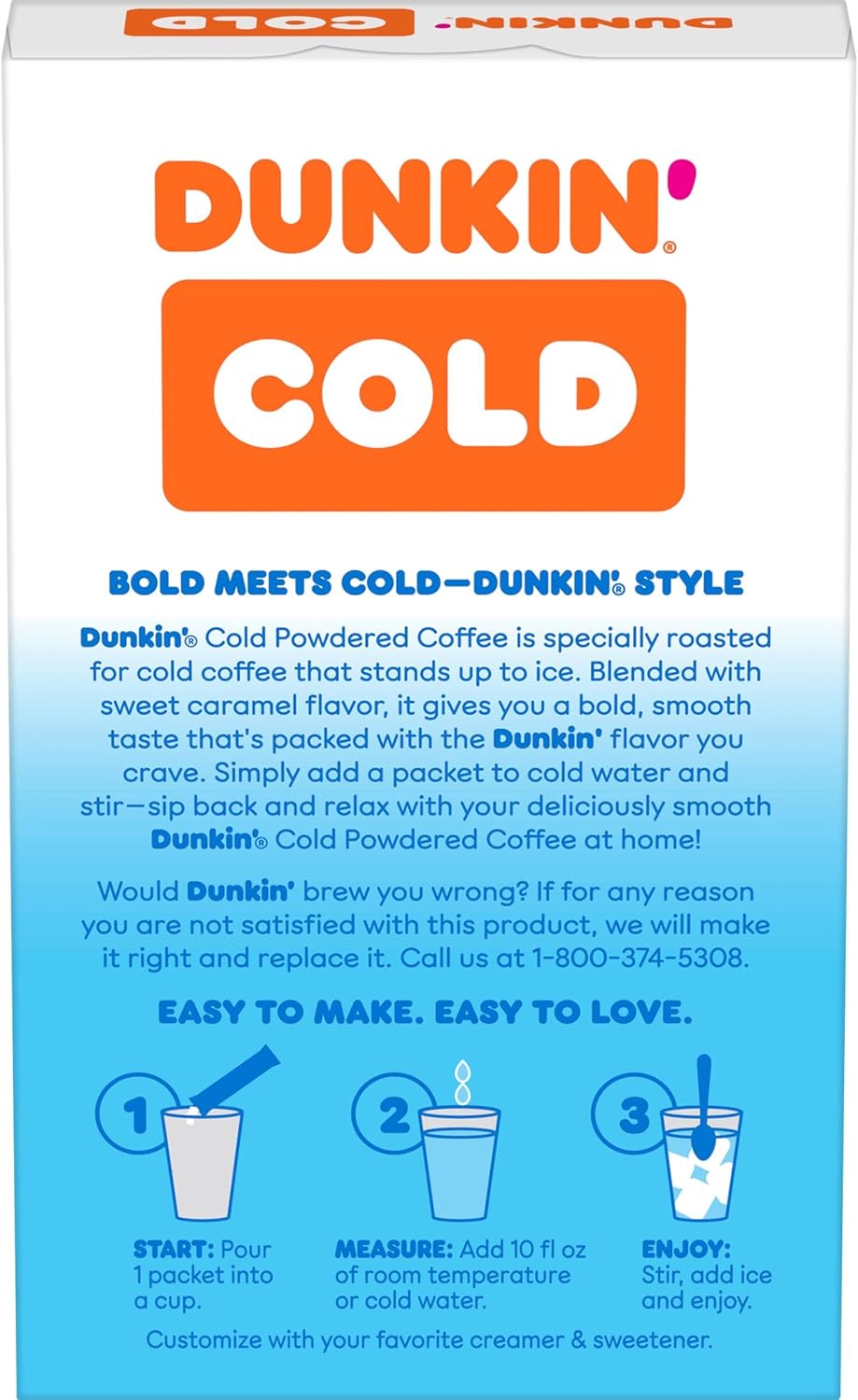 When Making Iced Coffee At Home, You Need Something Bold To Take On The Cold. Dunkin Cold Caramel Artificially Flavored Coffee Steps Up To The Task — And These Powdered Instant Coffee Packets Make It Beyond Convenient. Simply Add A Packet To Cold Water, Stir And Add Ice. Or, Add In Your Favorite Creamer And Sweetener For An Even More Personalized Experience. Either Way, You CanT Go Wrong. Dunkin Cold Coffee Is Specially Roasted To Stand Up To Ice. ItS Strong, Not Watery, With A Smooth, Bold Taste ThatS Packed With The Dunkin Flavor You Crave And Blended With A Sweet Caramel Flavor. Stock Up Now To Enjoy Instant Iced Coffee Anytime