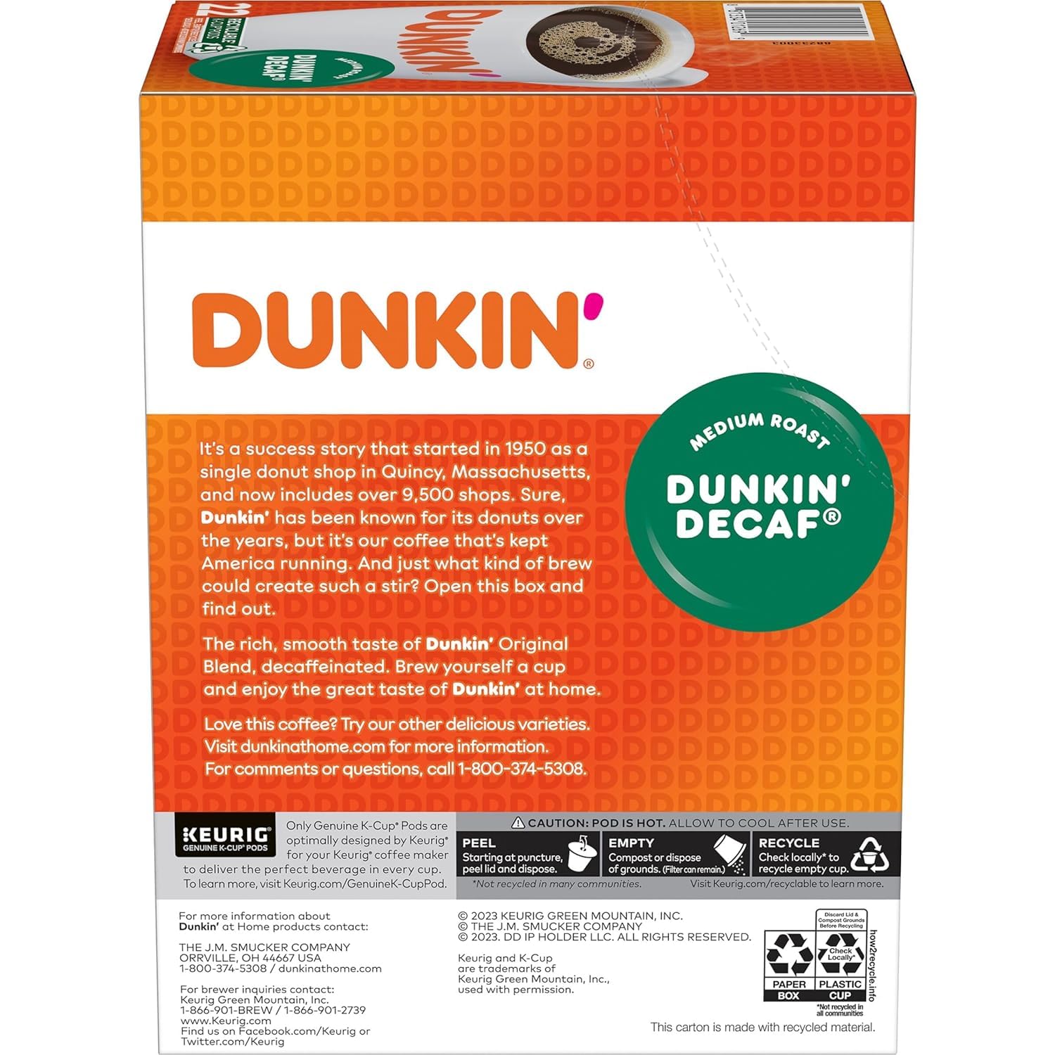 Love That Dunkinā Coffee Taste But Prefer Less Caffeine Count On Dunkinā Decaf Coffee Pods For Medium Roast Decaffeinated Coffee That Hits The Spot. These Convenient K-Cup Pods Contain Coffee Made From Premium Beans, Blended To Deliver That Same Rich, Smooth Taste As Dunkinā Original Blend. ItāS That Perfect, No-Fuss Flavor, Just Like The Cup YouāD Order From The Counter. Decaffeinated And Ready In A Snap. So, When The Craving Strikes And ThereāS Not Even Time To Make It To A Drive-Thru, Just Pop A Pod Into Your Keurig Machine And Enjoy Your Go-To Decaf Dunkinā Coffee Taste At Home