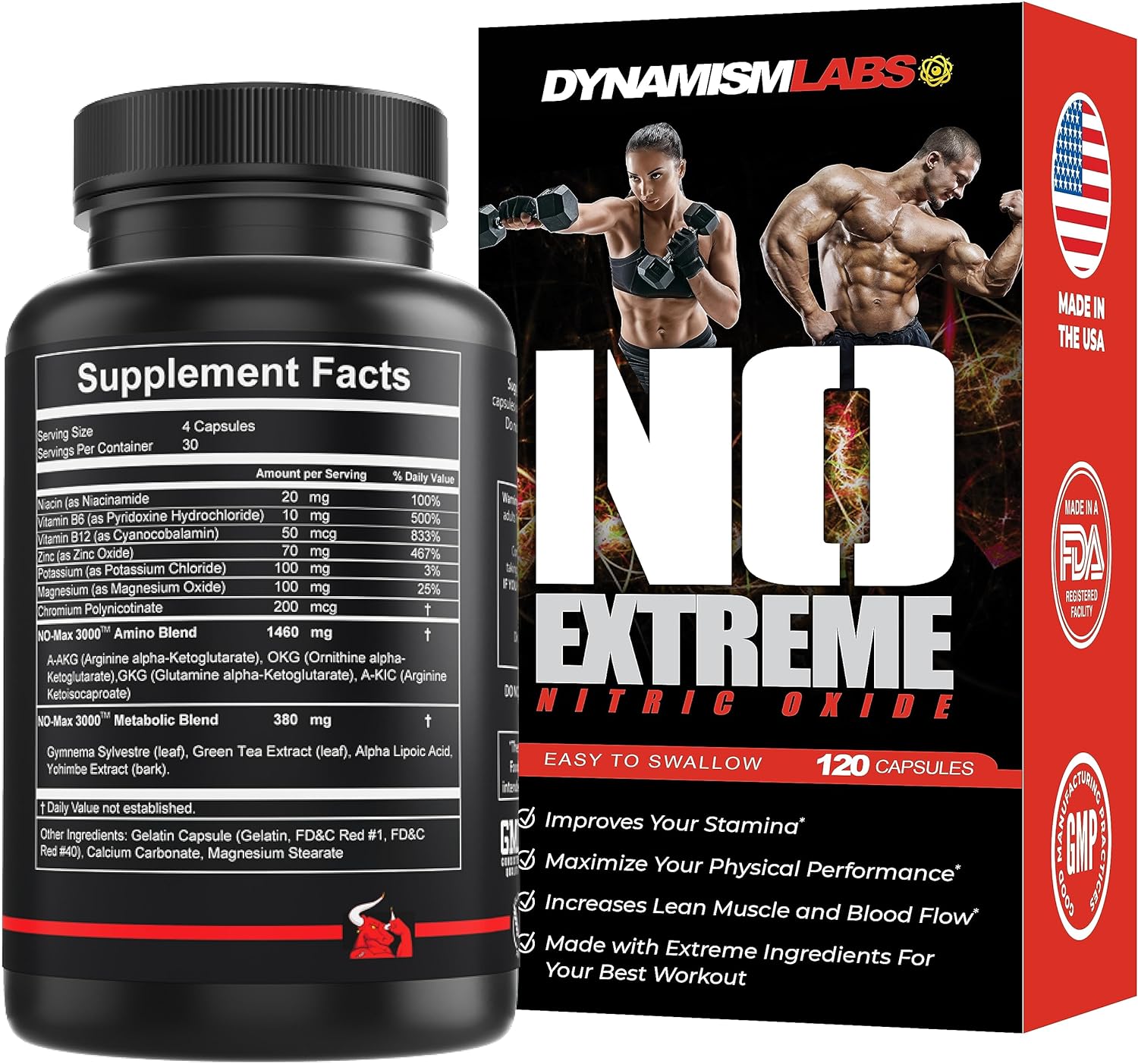 Dynamism Labs NO Extreme Pre-Workout | Nitric Oxide Performance Supplement with AKG, OKG, Vitamin B6, Vitamin B12, Green Tea Extract | Build Muscle & Increase Stamina | Made in USA (120 Capsules)