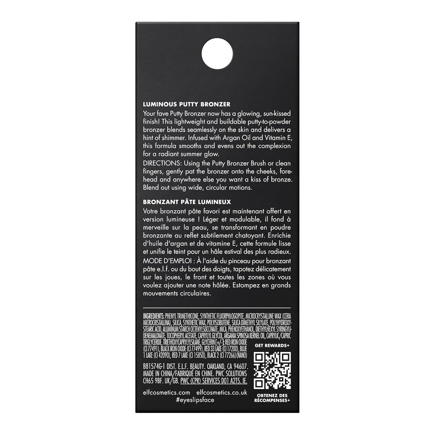 What is it: A lightweight and buildable putty-to-powder bronzer that gives skin a radiant, glowing finish. Why you'll love it: Unique putty-to-powder formula infused with a hint of shimmer Highly pigmented, creamy color melts into skin for a natural, sun-kissed glow Lightweight, buildable, and non-greasy wear Enriched with argan oil and vitamin E Key ingredients: Argan Oil Vitamin E Great for: Oily, Normal, Dry, and Combination Skin Types Talk about a glow up: your favorite Putty Bronzer is now available in a radiant finish! The creamy putty-to-powder bronzer blends seamlessly into skin, giving you a naturally bronzed look with a hint of shimmer. The formula is lightweight, non-greasy, and highly pigmented to smooth your complexion and impart a summer glow all year round. Plus, it’s infused with skin-loving argan oil and vitamin E. All e.l.f. products are proud to be 100% vegan, cruelty-free, and Leaping Bunny Certified. Because kindness is chic,BRONZER FOR RADIANT GLOW: Talk about a glow up: your favorite Putty Bronzer is now available in a radiant finish! The creamy putty-to-powder bronzer blends seamlessly into skin, giving you a naturally bronzed look with a hint of shimmer,HIGHLY-PIGMENTED FORMULA: The formula is lightweight, non-greasy, and highly pigmented to smooth your complexion and impart a summer glow all year round,INFUSED WITH VITAMIN E: e.l.f. Luminous Putty Primer is enriched with Vitamin E & Argan Oil. Great for all skin types,BEAUTY TIP: For a smooth, long-lasting sun-kissed glow, prep the face with our Putty Primers and pair with our Putty Blushes,SKIN-LOVING INGREDIENTS: All e.l.f. products are made from skin-loving ingredients you want, minus the toxins you don’t—all at good-for-you prices. All e.l.f. products are 100% vegan, cruelty-free, and leaping bunny certified