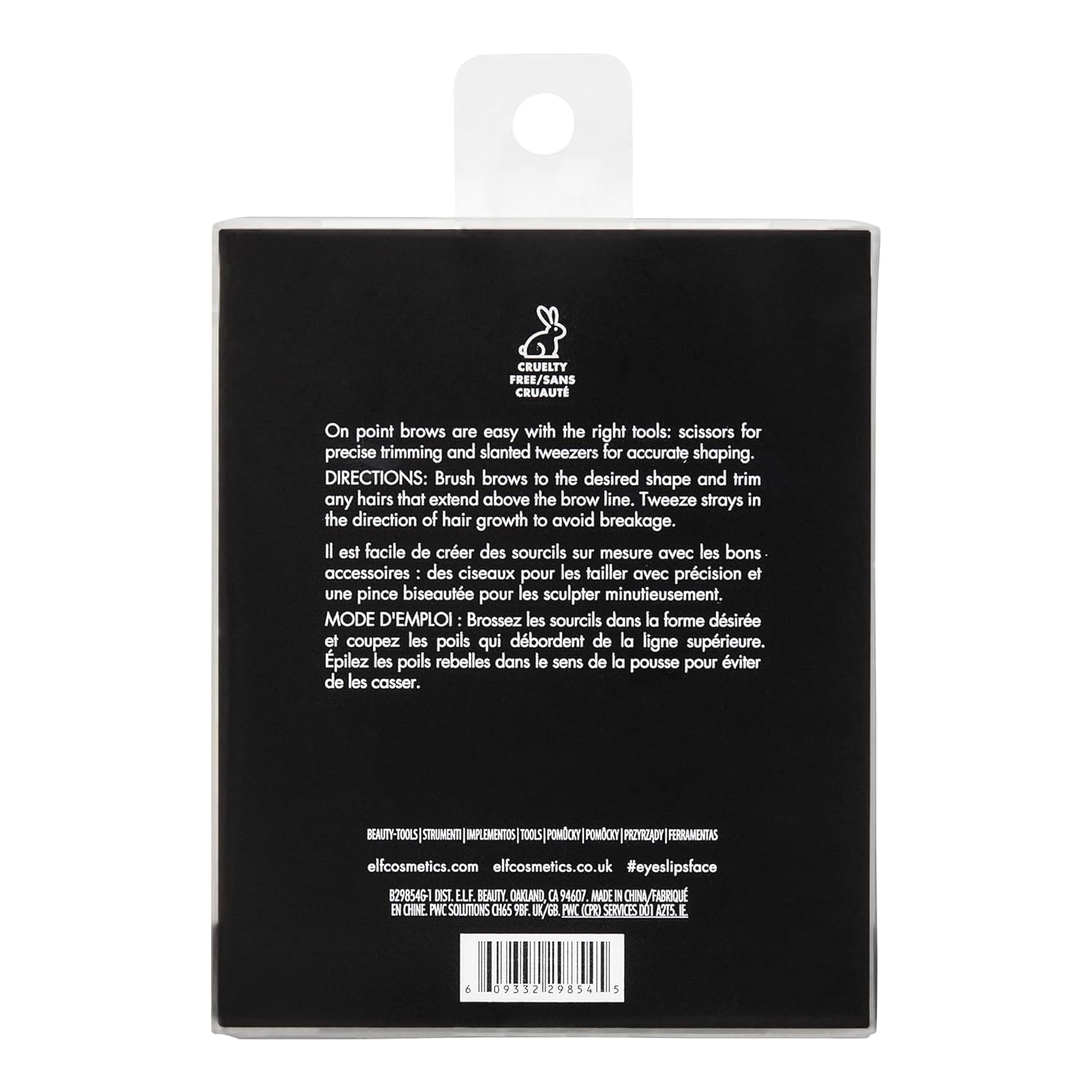 About this item THE ULTIMATE EYEBROW DUO: Brows on point! This eyebrow grooming essentials set contains a duo of tools for an easy brow routine and gorgeous brow look. ANGLED SCISSORS FOR PRECISION: The sharp, stainless steel eyebrow scissors feature an angled design to precisely trim hairs that extend above the brow line. SLANTED TWEEZERS FOR PLUCKING: The slanted tweezers help you accurately pluck and shape for extra-stunning brows. HOW TO USE: Brush brows to the desired shape and trim any hairs that extend above the brow line. Tweeze strays in the direction of hair growth to avoid breakage. SKIN-LOVING INGREDIENTS: All e.l.f. products are made from skin-loving ingredients you want, minus the toxins you don’t—all at good-for-you prices. All e.l.f. products are 100% vegan, cruelty-free, and leaping bunny certified. See more product details,THE ULTIMATE EYEBROW DUO: Brows on point! This eyebrow grooming essentials set contains a duo of tools for an easy brow routine and gorgeous brow look,ANGLED SCISSORS FOR PRECISION: The sharp, stainless steel eyebrow scissors feature an angled design to precisely trim hairs that extend above the brow line,SLANTED TWEEZERS FOR PLUCKING: The slanted tweezers help you accurately pluck and shape for extra-stunning brows,HOW TO USE: Brush brows to the desired shape and trim any hairs that extend above the brow line. Tweeze strays in the direction of hair growth to avoid breakage,SKIN-LOVING INGREDIENTS: All e.l.f. products are made from skin-loving ingredients you want, minus the toxins you don’t—all at good-for-you prices. All e.l.f. products are 100% vegan, cruelty-free, and leaping bunny certified