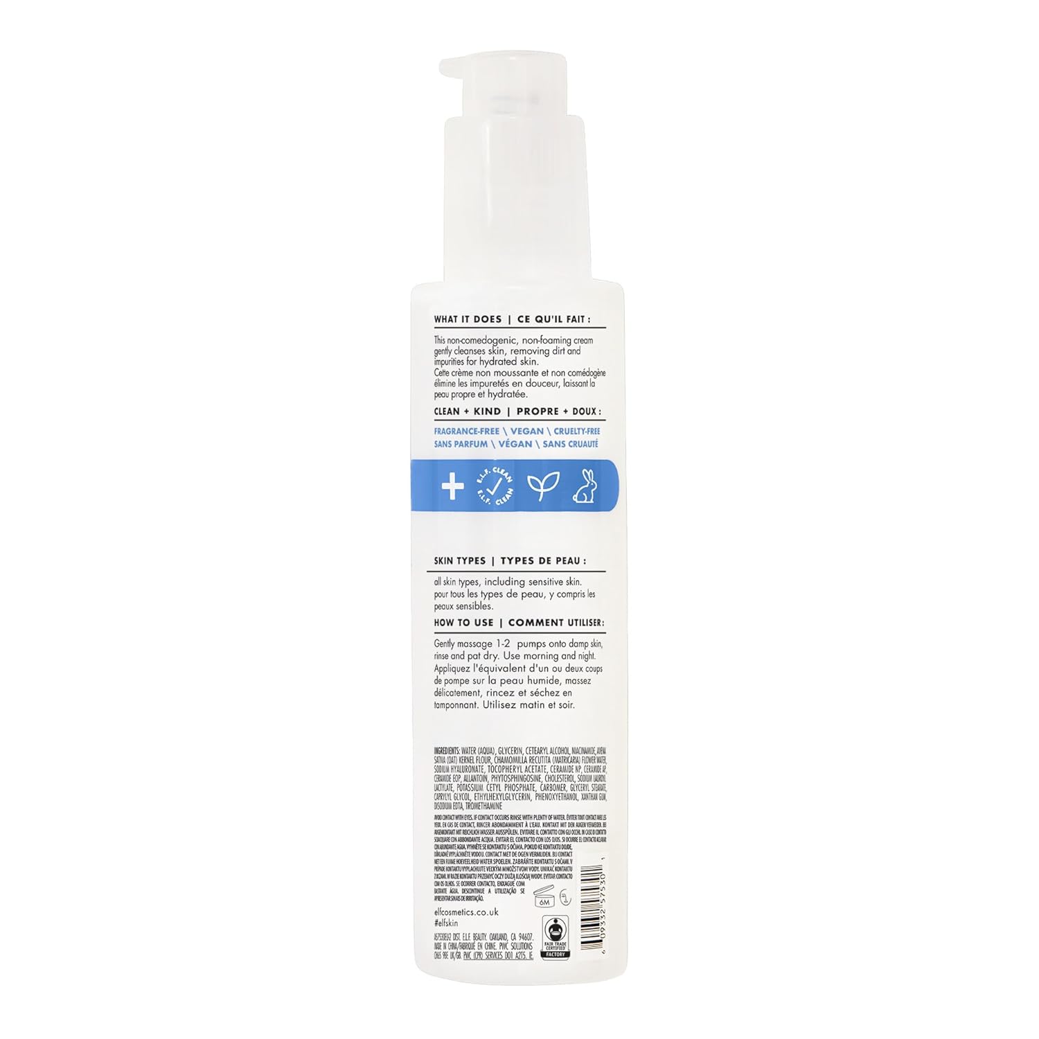 About this item HYDRATING & GENTLE FACIAL CLEANSER: Our non-foaming cream cleanser gently cleanses to leave your skin feeling refreshed, hydrated, and squeaky clean. CLEANSES WITHOUT IRRITATION: Pure Skin Cleanser effectively removes dirt, oil and impurities without irritation. Gentle enough for all skin types- even sensitive skin. NOURISHING ESSENTIALS: Made with Oat Milk to nourish & soothe skin, Niacinamide to shrink pores & even out skin tone, Allanoin to soothe & skin, Ceramides to build up the skin's moisture barrier & Hyaluronic Acid to lock moisture for a plump complexion. HOW TO USE: Gently massage 1-2 pumps onto damp skin, rinse and pat dry. Use morning and night. Pairs well with e.l.f. Pure Skin Toner and e.l.f. Pure Skin Moisturizer. VEGAN & CRUELTY-FREE: e.l.f. stands with every eye, lip, face, paw and fin. Proudly vegan, e.l.f. is double-certified cruelty-free by Leaping Bunny & PETA. See more product details,HYDRATING & GENTLE FACIAL CLEANSER: Our non-foaming cream cleanser gently cleanses to leave your skin feeling refreshed, hydrated, and squeaky clean,CLEANSES WITHOUT IRRITATION: Pure Skin Cleanser effectively removes dirt, oil and impurities without irritation. Gentle enough for all skin types- even sensitive skin,NOURISHING ESSENTIALS: Made with Oat Milk to nourish & soothe skin, Niacinamide to shrink pores & even out skin tone, Allanoin to soothe & skin, Ceramides to build up the skin's moisture barrier & Hyaluronic Acid to lock moisture for a plump complexion,HOW TO USE: Gently massage 1-2 pumps onto damp skin, rinse and pat dry. Use morning and night. Pairs well with e.l.f. Pure Skin Toner and e.l.f. Pure Skin Moisturizer,VEGAN & CRUELTY-FREE: e.l.f. stands with every eye, lip, face, paw and fin. Proudly vegan, e.l.f. is double-certified cruelty-free by Leaping Bunny & PETA