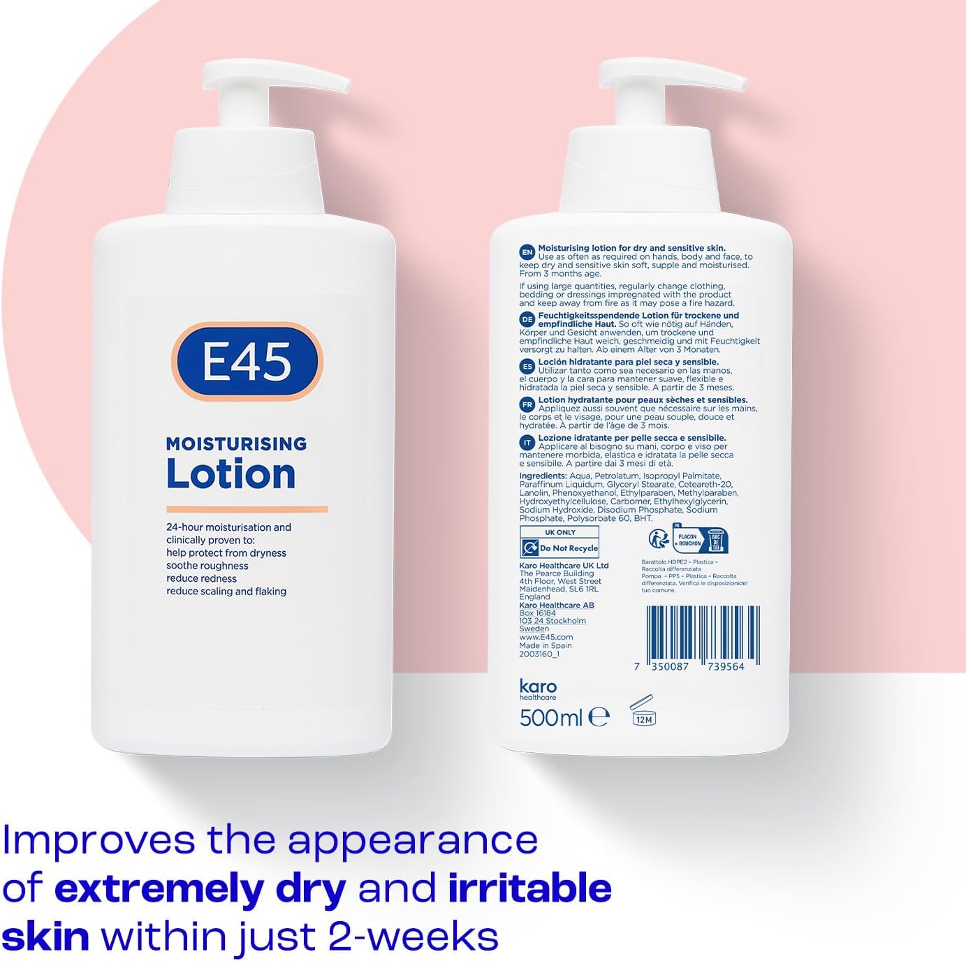 LONG-LASTING DRY SKIN CARE β E45 Lotion is a light, unperfumed lotion that can be used all over the body, including the face, to provide long-lasting care for dry and sensitive skin. It is a light daily moisturiser for dry skin that keeps your skin feeling soft and deeply hydrated. Our aqueous cream alternative also helps the skin to retain moisture and can sooth chilblains and frost bite. E45 lotion has been formulated to give deep moisturisation that lasts throughout the dayDERMATOLOGICALLY TESTED β This lotion has been formulated by skin care experts at E45 and is perfume free and dermatologically tested and is a suitable moisturiser for even sensitive skin. E45 Lotion is clinically proven to help protect the skin from dryness, soothe roughness, reduce redness, and reduce scaling and flaking. In just 2 weeks, the lotion can help to visibly reduce redness and improve the appearance of extremely dry and irritable skin when applied dailyMOISTURISING INGREDIENTS β E45 Lotion contains a purified, hypoallergenic form of lanolin with excellent moisturising properties. It soothes, protects, and cares for your skin. This light lotion is quickly and easily absorbed to keep your skin feeling soft, supple, and hydrated and the pump makes it easy to distribute. E45 Lotion's gentle formulation can be used daily on very dry and sensitive skin and is suitable for the whole family, including babies over 3 monthsQUALITY SKINCARE EVERY DAY β For 60 years, E45 has been a skincare expert in dry and itchy skin and treatment for eczema, psoriasis, ichthyosis and other dry skin conditions. We understand the importance of quality everyday products that care for your skin with minimal fuss. The E45 range of products has been developed for different skin types and parts of the body and works hard to protect and maintain skin health. It has proven dermatological expertise dedicated to vulnerable dry skin