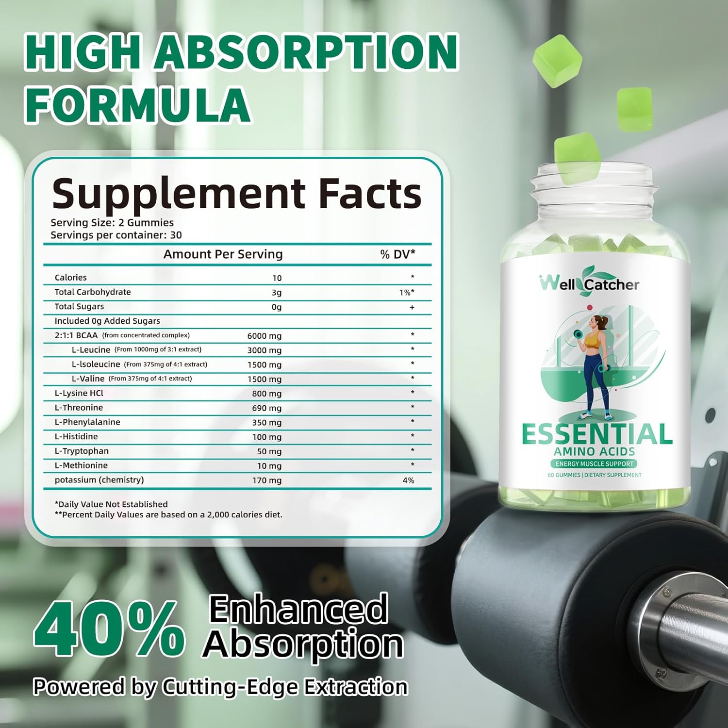 About this item ALL 9 ESSENTIAL AMINO ACIDS (EAA): The body needs additional amino acids to maintain optimal performance. Our amino acids gummies contain bcaas amino acids (L-Leucine, L-Isoleucine and L-Valine) L-Lysine, L-Threonine, L-Phenylalanine, L-Methionine, L-Histidine, and L-Tryptophan to keep you in the the amino balance you need ENHANCE ATHLETIC PERFORMANCE: Essential Amino Acids are the ultimate aid for sports enthusiasts. Say goodbye to powders, just two amino acids supplement gummies are all you need to boost protein synthesis, muscle strength and athletic endurance, anytime, anywhere ACCELERATORS FOR POST-EXERCISE RECOVERY: Muscle lifting is the key to improving athletic performance. Consumption of amino acids supplement promotes muscle protein synthesis, speeds up post-exercise muscle recovery and relieves muscle soreness IMMUNITY SUPPORT: Amino acids(eaas) provide the necessary materials for the synthesis of immunoglobulins, which ensures the continuous synthesis and renewal of proteins, maintains the normal metabolic function of the body, provides energy for the body and improves immunity 30-DAY SUPPLY: Our pectin-based green apple flavoured bcaa gummies for men women are Suitable for adults kids and sweetened from stevia, healthy, sugar-free, non-GMO, vegan, gluten-free and made in a GMP-certified facility. It's easy to meet your daily nutritional needs whether you're at home or on the go See more product details,ALL 9 ESSENTIAL AMINO ACIDS (EAA): The body needs additional amino acids to maintain optimal performance. Our amino acids gummies contain bcaas amino acids (L-Leucine, L-Isoleucine and L-Valine) L-Lysine, L-Threonine, L-Phenylalanine, L-Methionine, L-Histidine, and L-Tryptophan to keep you in the the amino balance you need,ENHANCE ATHLETIC PERFORMANCE: Essential Amino Acids are the ultimate aid for sports enthusiasts. Say goodbye to powders, just two amino acids supplement gummies are all you need to boost protein synthesis, muscle strength and athletic endurance, anytime, anywhere,ACCELERATORS FOR POST-EXERCISE RECOVERY: Muscle lifting is the key to improving athletic performance. Consumption of amino acids supplement promotes muscle protein synthesis, speeds up post-exercise muscle recovery and relieves muscle soreness,IMMUNITY SUPPORT: Amino acids(eaas) provide the necessary materials for the synthesis of immunoglobulins, which ensures the continuous synthesis and renewal of proteins, maintains the normal metabolic function of the body, provides energy for the body and improves immunity,30-DAY SUPPLY: Our pectin-based green apple flavoured bcaa gummies for men women are Suitable for adults kids and sweetened from stevia, healthy, sugar-free, non-GMO, vegan, gluten-free and made in a GMP-certified facility. It's easy to meet your daily nutritional needs whether you're at home or on the go