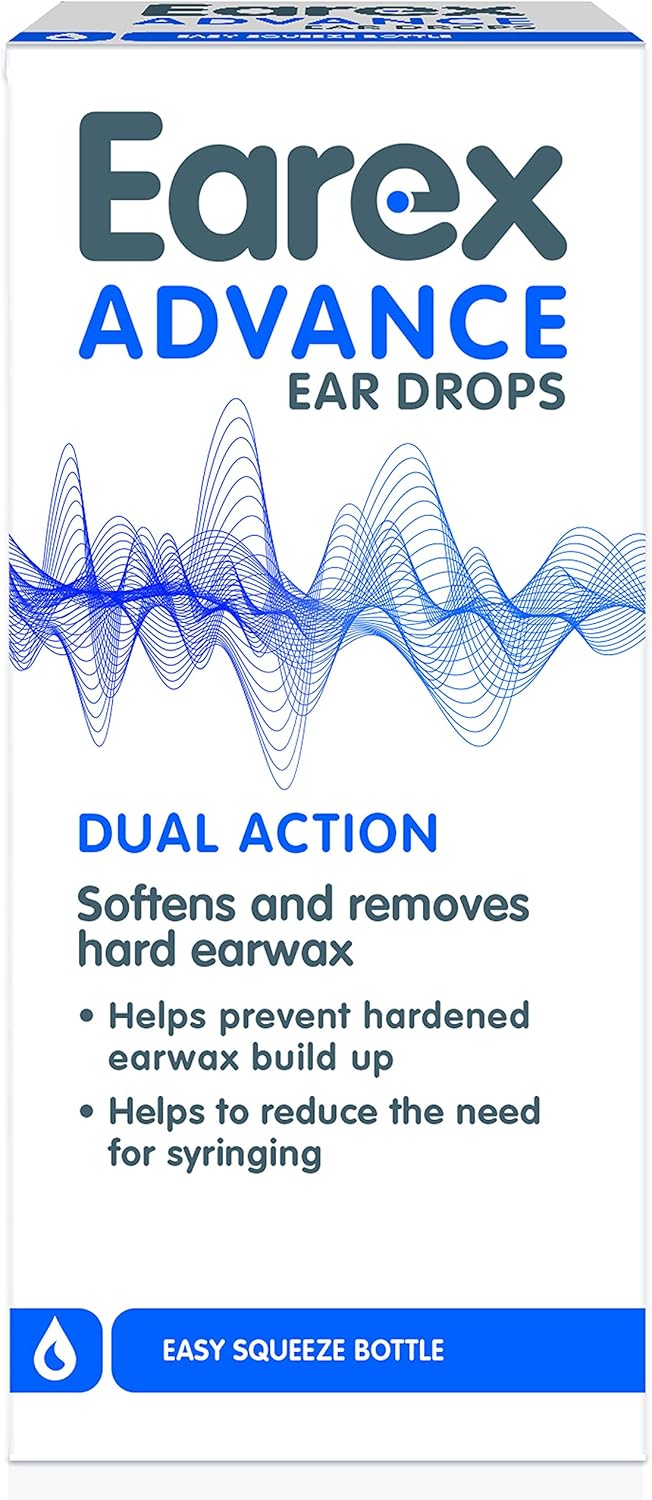 Product Description For a dual-action treatment of earwax build up Earex Advance Ear Drops has a dual action formula to soften and remove hard earwax, so you can hear more of the moments that matter. Used regularly, Earex Advance Ear Drops can also prevent the build-up of hardened earwax. Ingredients Glycerol BP, Urea Hydrogen Peroxide 5% P.when('A').execute(function(A) { A.on('a:expander:toggle_description:toggle:collapse', function(data) { window.scroll(0, data.expander.$expander[0].offsetTop-100); }); }); Safety Warning Keep out of the sight and reach of children. Do not use this product after the expiry date printed on the carton and bottle. Use within 30 days of first opening otherwise discard the contents. Warnings as the earwax begins to soften, before it is removed, it can begin to swell slightly, which might give you a feeling of fullness in the ear, temporarily affect hearing and occasionally can cause slight dizziness or affect balance. A temporary bubbling sensation may occur. Should these symptoms persist or worsen, or you experience any other side effects or burning, stop using drops and seek advice from your doctor or pharmacist. Drops should only be used in the ear. Avoid contact with the eyes; in case of accidental contact, rinse thoroughly with clean water and consult a doctor. Do not use if ear drum has been damaged or perforated, there is an infection or any problems with ears (eczema, itching sensation, dermatitis or any other local cutaneous (skin) problem). Do not swallow. Do not use at the same time as any other ear drop preparations. Do not insert hearing aids immediately after use but allow at least 15 minutes for any residue to be removed. Suitable for children following medical advice. Manufacturer Contact Information G R Lane Health Products Ltd, Sisson Road, Gloucester, GL2 0GR See more,Dual action, softens and removes hard earwax,Helps prevent hardened earwax build up,Suitable for adults, the elderly and children following medical advice,Suitable for children from 2 years and upwards,Helps to reduce the need for syringing,Suitable for children from 2 years and upwards,Dual action, Softens and removes hard earwax, Helps prevent hardened earwax build up, Helps to reduce the need for syringing,The dual action formula of Earex Advance earwax removal drops softens and removes hard earwax
