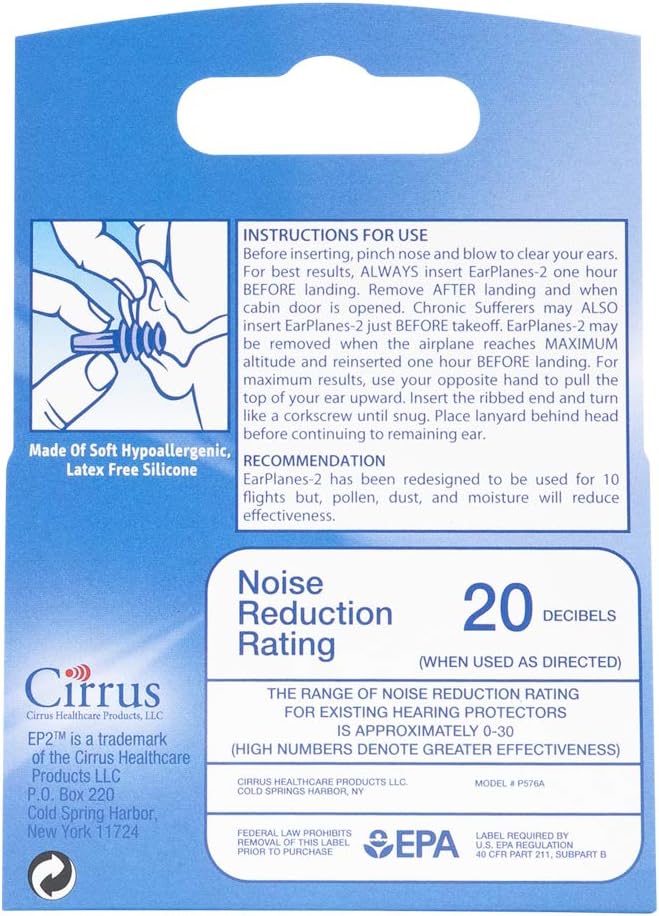 Directions Before Inserting, pinch nose and blow. For best results, ALWAYS insert eP2 one Hour BEFORE landing. Remove AFTER landing and when cabin door is opened. Chronic sufferers may ALSO insert eP2 just BEFORE takeoff. eP2 may be removed when the airplane reaches MAXIMUM altitude and reinserted one hour BEFORE landing. For maximum results, use your opposite hand to pull the top of your ear upward. Insert the ribbed end and turn like a corkscrew until snug. Safety Warning If recommendations are not adhered to the protection afforded by the earplugs will be serverely impaired. These earplugs should not be used where there is risk that the connecting cord could be caught up during use. Unsuitable for children,The information below applies to each unit in the pack,Reusable for up to 5 flights,Helps prevent inflight ear pressure, popping and discomfort,Made from Hypoallergenic Silicone,Reduces harsh noise (24 SNR)