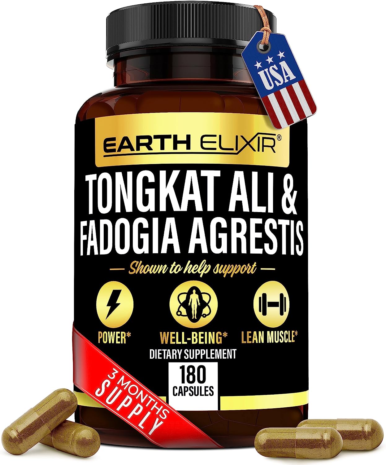 Earth Elixir Fadogia Agrestis 600mg and Tongkat Ali 500mg Supplements (180 Capsules) - Made in USA - 3 Month Supply – 3rd Party Tested - Long Jack - Tongkat Ali Fadogia Agrestis Supplements for Men