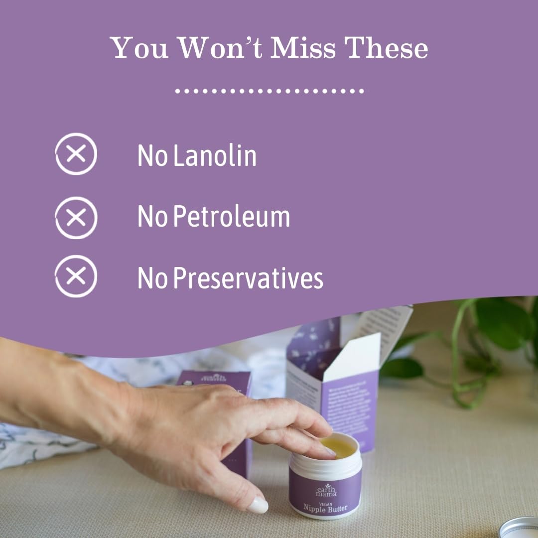 About this item CERTIFIED BY OREGON TILTH: Earth Mama’s Vegan Nipple Butter is Certified by Oregon Tilth, made with organic calendula and cocoa butter to soothe and moisturize hard-working nipples. NIPPLE CREAM SAFE FOR BREASTFEEDING: Made without petroleum, preservatives, beeswax or lanolin, Earth Mama's breastfeeding calendula cream is non-GMO Project Verified, which means there is no need to wash or wipe it off before nursing your baby. Vegan, Plant-Based Nipple Cream: This Earth Mama Vegan Nipple Butter helps make breastfeeding and pumping more comfortable. We're on a mission to free mothers from the fear of breastfeeding during postpartum. DERMATOLOGIST AND CLINICALLY TESTED FOR IRRITATION: Earth Mama Vegan Nipple Butter helps soothe nipples and also offers intense moisture and relief on lips, cuticles, & dry skin. BABY SHOWER GIFT IDEA: Give Earth Mama Vegan Nipple Butter as a gift for new moms, add it to your baby registry, include it in your hospital bag essentials or postpartum essentials.  See more product details,CERTIFIED BY OREGON TILTH: Earth Mama’s Vegan Nipple Butter is Certified by Oregon Tilth, made with organic calendula and cocoa butter to soothe and moisturize hard-working nipples,NIPPLE CREAM SAFE FOR BREASTFEEDING: Made without petroleum, preservatives, beeswax or lanolin, Earth Mama's breastfeeding calendula cream is non-GMO Project Verified, which means there is no need to wash or wipe it off before nursing your baby,Vegan, Plant-Based Nipple Cream: This Earth Mama Vegan Nipple Butter helps make breastfeeding and pumping more comfortable. We're on a mission to free mothers from the fear of breastfeeding during postpartum,DERMATOLOGIST AND CLINICALLY TESTED FOR IRRITATION: Earth Mama Vegan Nipple Butter helps soothe nipples and also offers intense moisture and relief on lips, cuticles, & dry skin,BABY SHOWER GIFT IDEA: Give Earth Mama Vegan Nipple Butter as a gift for new moms, add it to your baby registry, include it in your hospital bag essentials or postpartum essentials