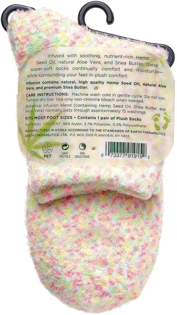 About this item Plush SOOTHE, RELIEVE, AND MOISTURIZE - Earth Therapeutics Hemp Seed Oil Plush Socks are infused with comforting Hemp Seed Oil, moisturizing Shea Butter, and soothing Aloe Vera to help soothe, relieve, and moisturize feet. PLUSH COMFORT - These socks are made with an extra plush quality that surrounds your feet in luxurious comfort. VITAMIN E AND ALOE VERA - The socks are infused with Vitamin E and Aloe Vera to continually moisturize and pamper feet. DEEP HEALS AND REPAIRS - Use overnight for deep healing and repair of tired feet. FOR BEST RESULTS - Massage in your favorite foot lotion before slipping on the socks to leave feet feeling soft and smooth. Fits most foot sizes. One pair. Peach Confetti color. See more product details,Plush,SOOTHE, RELIEVE, AND MOISTURIZE - Earth Therapeutics Hemp Seed Oil Plush Socks are infused with comforting Hemp Seed Oil, moisturizing Shea Butter, and soothing Aloe Vera to help soothe, relieve, and moisturize feet,PLUSH COMFORT - These socks are made with an extra plush quality that surrounds your feet in luxurious comfort,VITAMIN E AND ALOE VERA - The socks are infused with Vitamin E and Aloe Vera to continually moisturize and pamper feet,DEEP HEALS AND REPAIRS - Use overnight for deep healing and repair of tired feet,FOR BEST RESULTS - Massage in your favorite foot lotion before slipping on the socks to leave feet feeling soft and smooth. Fits most foot sizes. One pair. Peach Confetti color