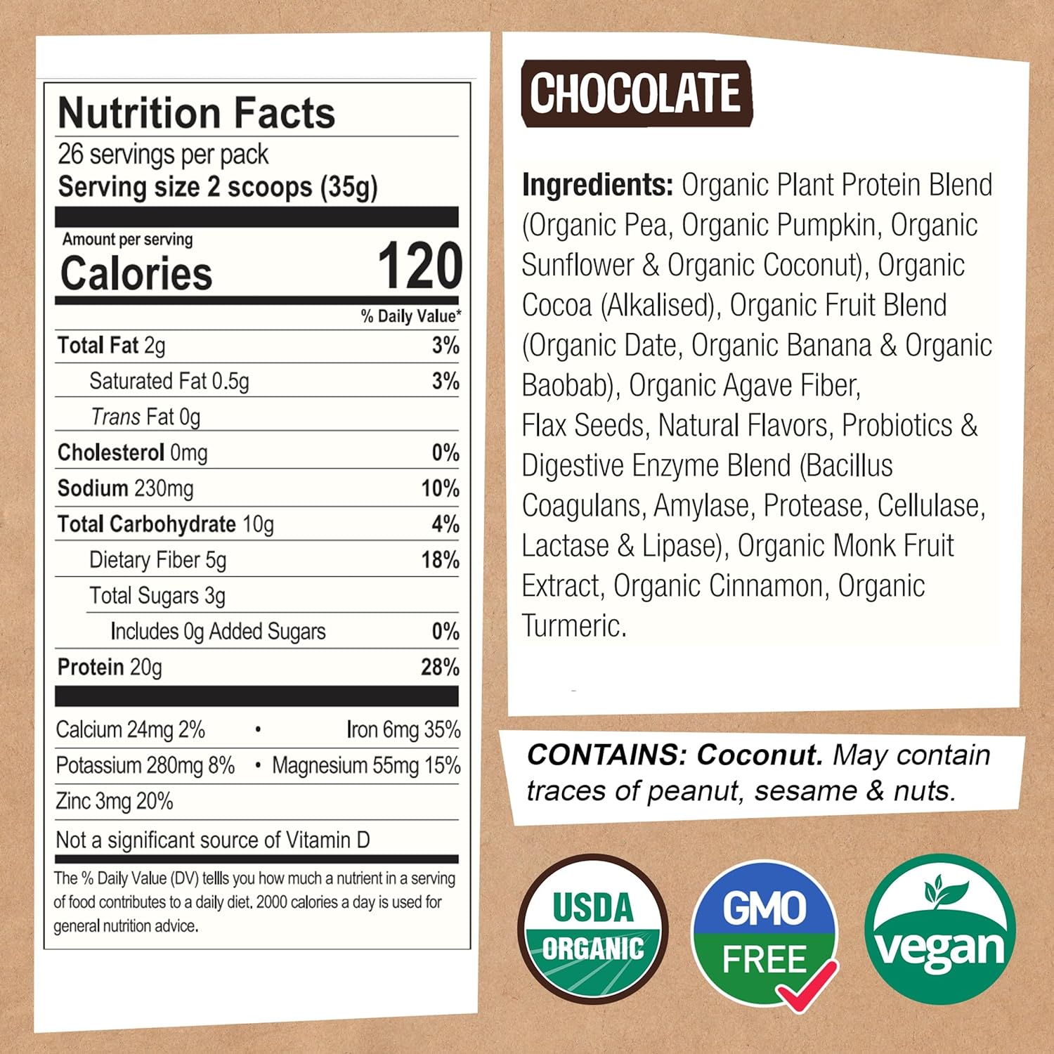 Earthchimp Organic Vegan Protein Powder - With Probiotics - Non Gmo, Dairy Free, Non Whey, Plant Based Protein Powder For Women And Men, Gluten Free - 26 Servings 32 Oz (Chocolate) No Scoop