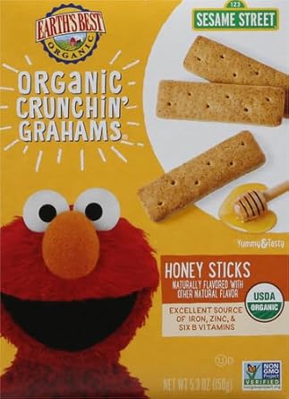 Product Description Earth's Best Organic is bringing play time to snack time with our range of tasty toddler crackers, cookies, smoothies, and snack bars inspired by your little one's favorite Sesame Street characters. Our snacks combine good-for-you ingredients with exciting shapes and flavors for a tasty treat that's both parent and toddler-approved. Your tot will love the classic flavor combinations in our PB&J Bites, staying mess-free and full on the go with our Sunny Days Snack Bars, or crunching on these delicious graham cracker sticks! Made with a blend of certified organic ingredients, our Organic Crunchin' Grahams do not contain artificial flavors or colors - so you know your toddler is getting the wholesome support they deserve with every bite. Wholesome flavor, wholesome fun- that's what makes us the Earth's Best brand. Brand Story By Earth's Best,ORGANIC SNACKS FOR KIDS: Playful Sesame Street characters, yummy organic flavors, and interactive back-of-box games make these cookies fun for your little one,KID'S LUNCH BOX ESSENTIAL: Full of nutrients like iron, zinc, and six B vitamins, these organic cookies are a perfect treat for lunch time, snack time, or anytime you're on the go,WHOLESOME INGREDIENTS: Crafted with a simple blend of ingredients, like organic honey, for a delicious snack both you and your toddler will love,EARTH'S BEST: Explore our full collection of organic baby food and toddler snacks to find stage 2 and stage 3 puree pouches, easy-to-digest baby formula, organic baby cereal, and more organic snacks,ORGANIC CRUNCHIN' GRAHAMS: Includes one 5.3 oz box of Earth's Best Organic Crunchin' Grahams