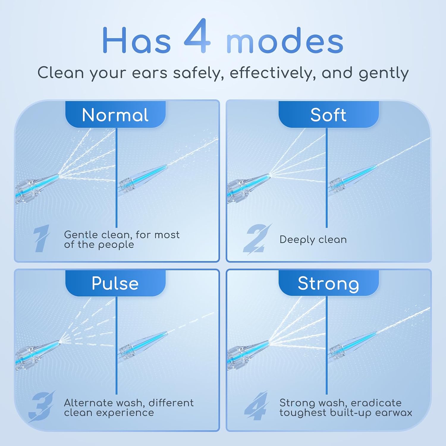 Efficient Electric Earwax RemovalOur Ear Cleaning System Has 4 Water Pressure Settings To Meet Your Different Needs, Helping You Remove Earwax Accumulation Easily