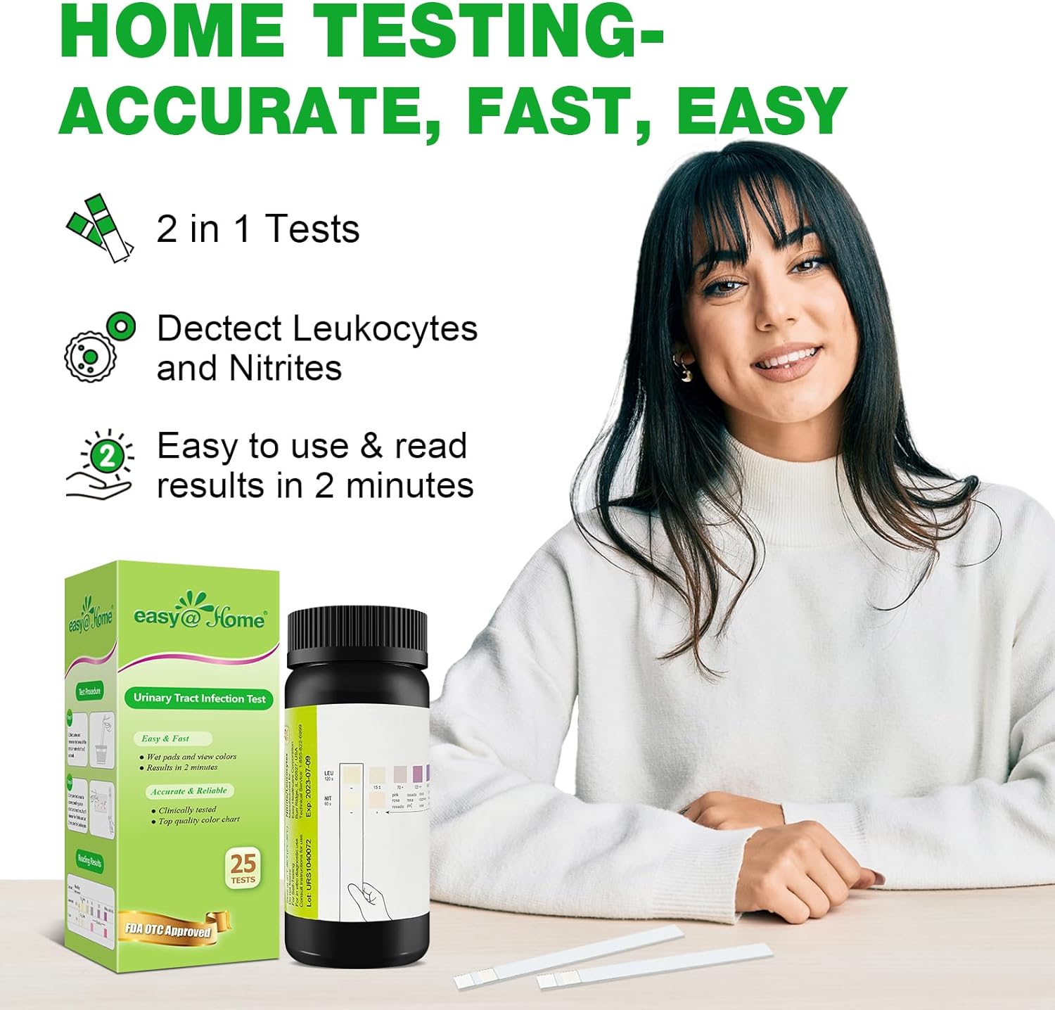 ? Fast UTI detection so you can obtain pain relief from burning and urgency, preventing more serious health problems. Do not let your UTIs be recurrent even if you have a chronic issue. Catch them early!? Highly Effective Natural Approach: Same type of UTI tests are performed at most doctor offices used to diagnose a UTI. That bladder control issue or yeast infection you think you have may be a UTI? Easy to Use: Have pads wet in urine sample for 1-2 seconds and read results within 2 minutes by comparing pads to color chart. Reliable: Two tests in one β including both Leukocyte (white blood cells) and Nitrite tests β both tests commonly used to diagnose a UTI? Save You a Trip and Money: FDA cleared for OTC use with assured accurate test results so that you can test for a UTI at home privately and accurately. 25 Tests (1 Bottle) for frequent users