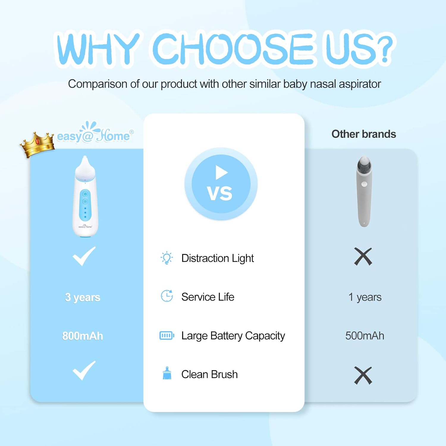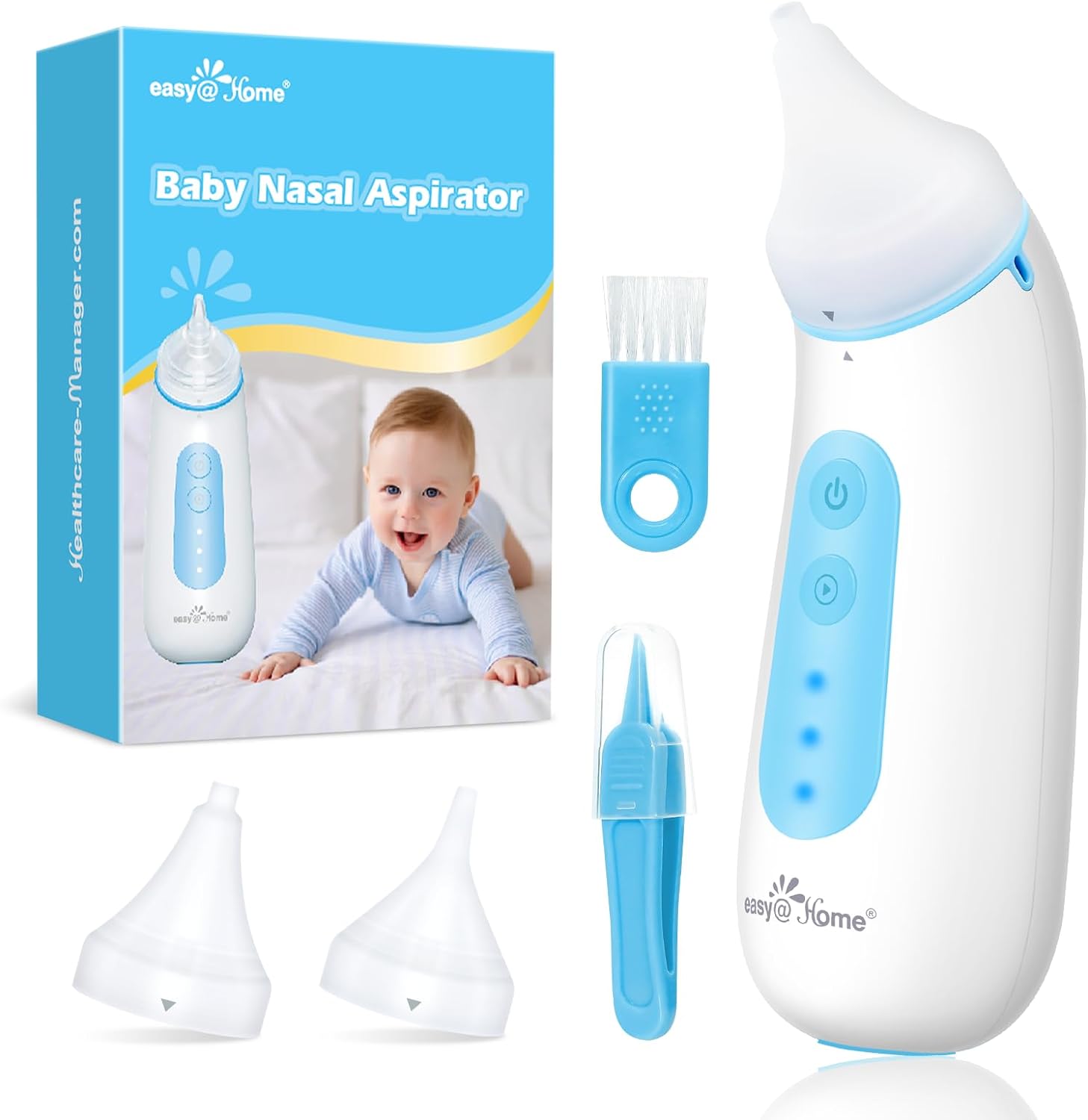 Safely And Naturally: Easy@Home baby nasal aspirator helps parents safely and naturally cleanse their baby's nasal cavity to ensure unobstructed breathing. It offers three levels of suction intensity for cleaning dried mucus of varied volumes and excess phlegm. Its soft suction prevents disturbing infants while they sleep. With the Easy@Home baby nasal aspirator, you can take care of your baby effectively at homeDistraction Light Mode: The nasal aspirator has a night light mode which shines with colorful light to attract the baby's attention and comfort the baby. Turn on the device and quickly press the power button 4 times to get this modeWaterproof and Easy to Clean: If the nose aspirator needs cleaning, it can be washed under the tap after each use. The top nozzle can easily be removed, and it is equipped with a small brush for easy cleaning of internal details. There are two reusable nasal suction tips included in the package, which are suitable for babies of different ages and conditionsBaby Aspirator Kit: The package comes with 2 reusable nasal suction tips of different sizes and for babies of different ages and conditions. Tweezer ideal for clamping components when cleaning and disinfection. You can also use to pick up baby boogersNote: Lay your baby down on their back. Use nasal saline drops if needed. Place the nozzle of the syringe just outside the baby’s nostril. Place it close enough to seal the nostril, but not inside. Limit use to three to four times per day. An aspirator for babies helps them breathe easier when they have stuffy noses. If your baby continues to have feeding and breathing problems, bring them to the doctor for a proper diagnosis