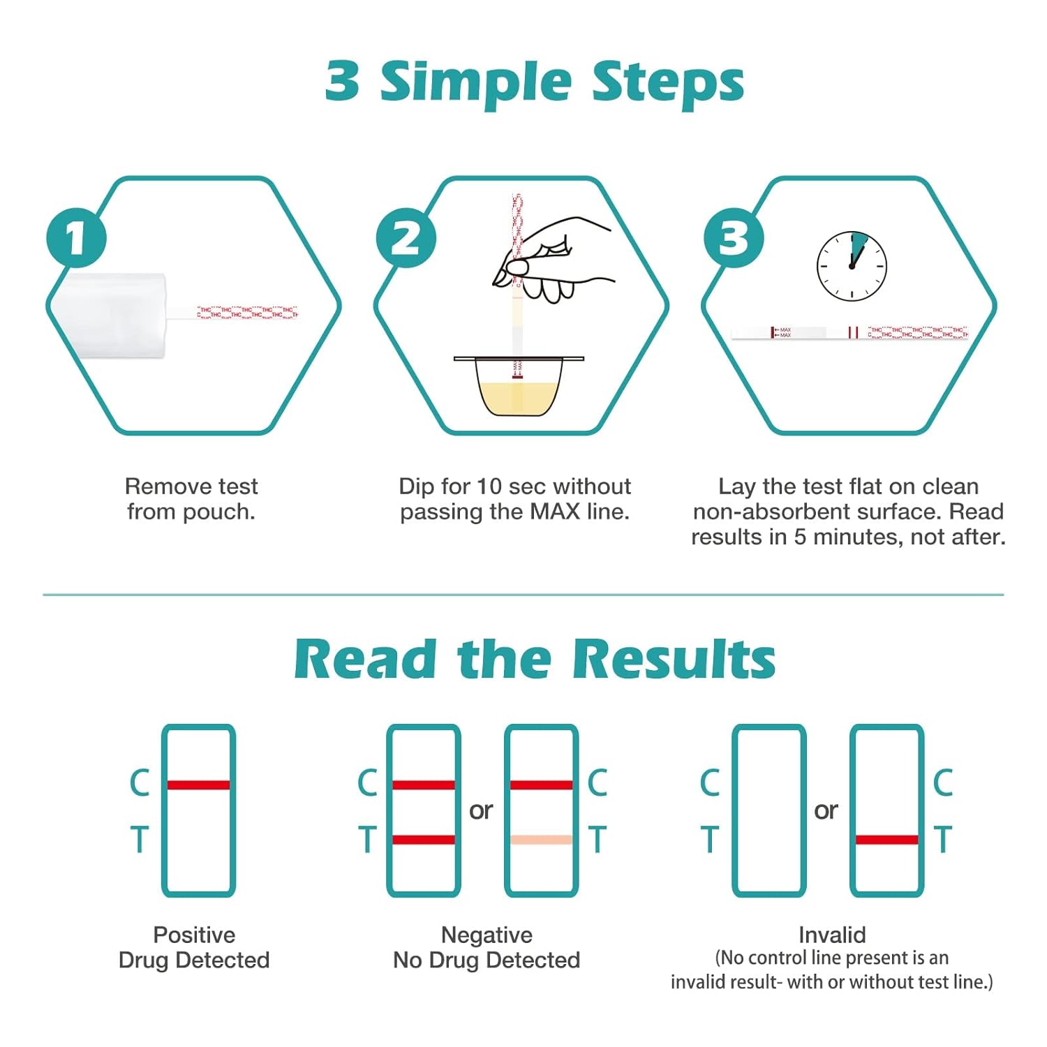 ? Sensitive: Detects THC with a recommended cutoff level 50ng/mL. Walk you through a detox program, preparing to pass a future test? Easy: Simply remove the test strip from the pouch and immerse the absorbent end into urine for 10 seconds without passing the MAX line; Lay the test strip flat, solid lines appear shortly? Fast: Results in 5 minutes. It is positive if only a control line appears in the result window; It is negative if both test line and control line appear. Note: even if the line is faint or thin, it still means a negative result? OTC use: Designs for at home and over the counter (OTC) use. The most cost reliable and effective method to track THC detox process regularly anytime at your own home? Quality: Professional customer support team in US. Easy@Home is dedicated to being the best home use tests provider. Contact us when assistance is needed
