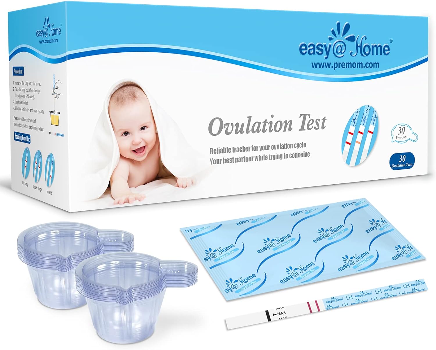 Ovulation Predictor Kit (OPK): Easy@Home ovulation predictor kit is specially designed for "trying to conceive" (TTC) women to get pregnant naturally. The OPK kit includes 30 LH test strips and 30 urine cups, which give women a greater chance of predicting their most fertile days, even if their cycle lengths varyAccurate Clear Ovulation Tests: Accurate and highly sensitive at detecting the LH surge. Easy@Home 30 ovulation tests are reliable at levels of LH as low as 25 mIU/mL. Easy@Home ovulation test strips help track your ovulation progression and minimize the chances of missing your LH peakEasy to Use: Dip the ovulation test strip in your urine for 10 seconds and read results within 3 to 5 minutes, check the result, and snap a picture with your phone. Test width of 5mm makes reading the result easy and clear. The smart Premom app will automatically align and interpret your valid test results for you! Premom and Easy@Home make it easy to track your most fertile days and maximize your chances of getting pregnantPowered by Ovulation Tracker App: The Premom app is an ovulation and cycle tracker designed to help women get pregnant quickly and naturally. You can scan and log your ovulation test result to get instant quantified hormone level results and know your chances of pregnancy on a daily basis. The digital app will track and monitor your LH hormone level trend right, which is particularly beneficial for women with PCOS, irregular cycles, multiple LH surges, or hard-to-recognize surgesExperienced and Professional Customer Service: Our team is available to assist with any questions and ensure you are satisfied with your results