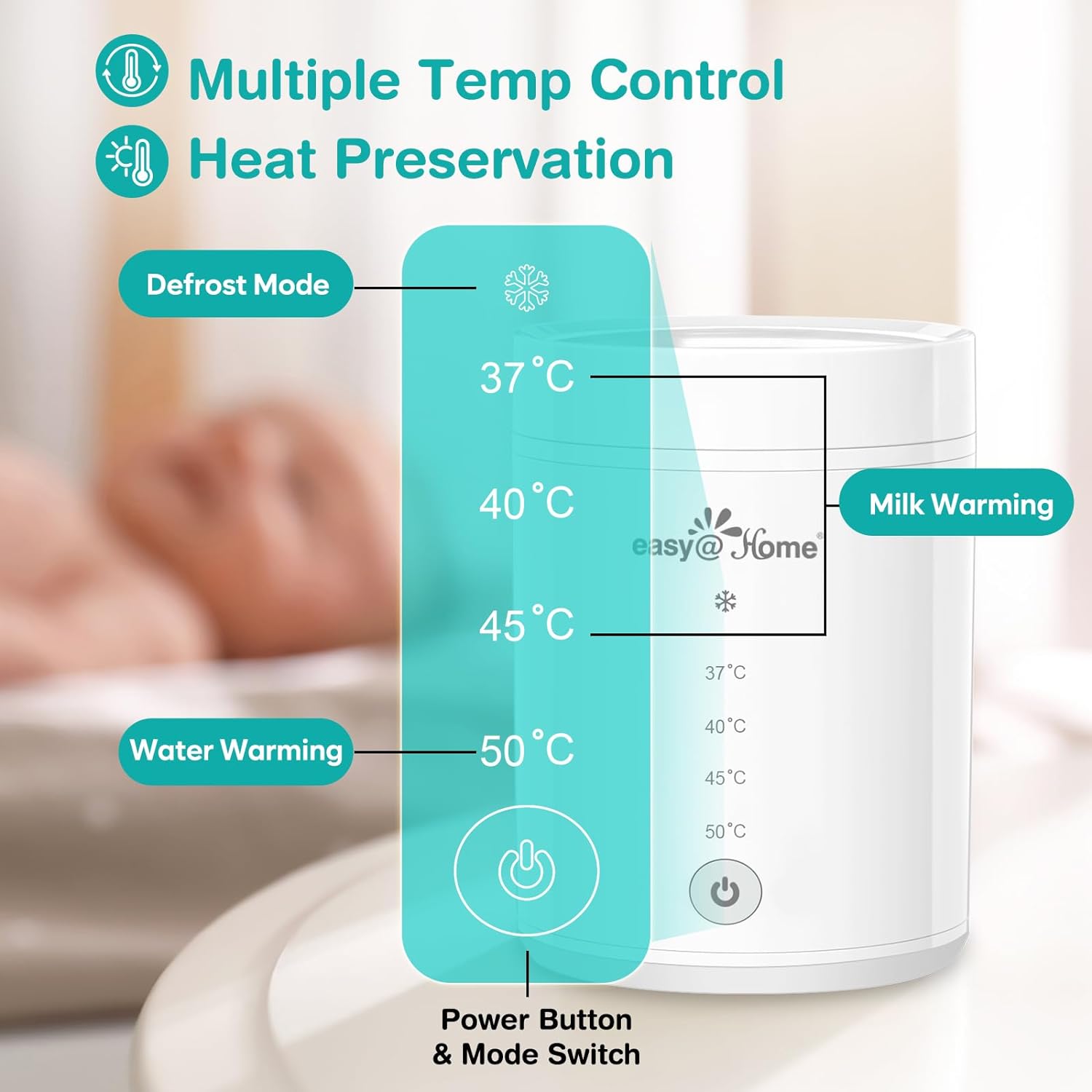 Convenient and Versatile Portable Bottle Warmer: Make feeding your baby on the go a breeze with Easy@Home ENW001 Portable Bottle Warmer. Our innovative device quickly defrosts and warms baby bottles or distilled water, converting electrical energy into heat energy through the heating piece. Whether you're traveling or out for a stroll, our portable bottle warmer offers convenience and versatility to ensure your baby's feeding time is hassle-freeCompatible with 92% of bottles on the market: Our bottle warmer is compatible with 55% of wide-bore bottles available on the market. With 6 adapters, it can accommodate up to 92% of bottles on the market. Before use, please check the mouth diameter of your bottle and select the appropriate adapter. As each brand's bottles come in different sizes, it's important to choose the most suitable adapter to ensure a proper fitSafe and Efficient Milk Warming: Our fast and efficient milk warmer that can warm 4oz/120ml of room temperature milk to 104°F/40°C in just 3 minutes (warming time may vary depending on milk volume, initial temperature, and bottle material). Our milk warmer is designed to provide a safe and efficient way to warm milk for your baby. Say goodbye to the hassle of warming milk and hello to a happy and content babyDefrost Mode: The bottle warmer is equipped with a defrost mode that activates automatically when the liquid temperature is below 59°F(15°C). In this mode, the blue light flashes in a breathing pattern. Once the temperature reaches 86°F(30°C), the defrosting process is complete and the warmer switches to milk warming mode, heating the liquid to 98.6°F(37°C) for optimal serving temperatureSafety First: Keep this product away from children to prevent burns. Prior to use, carefully read the instructions to avoid incorrect operation and burns. To prevent scalding, do not turn on the product when assembling the adapter, and do not connect the glass bottle to the warmer without the adapter
